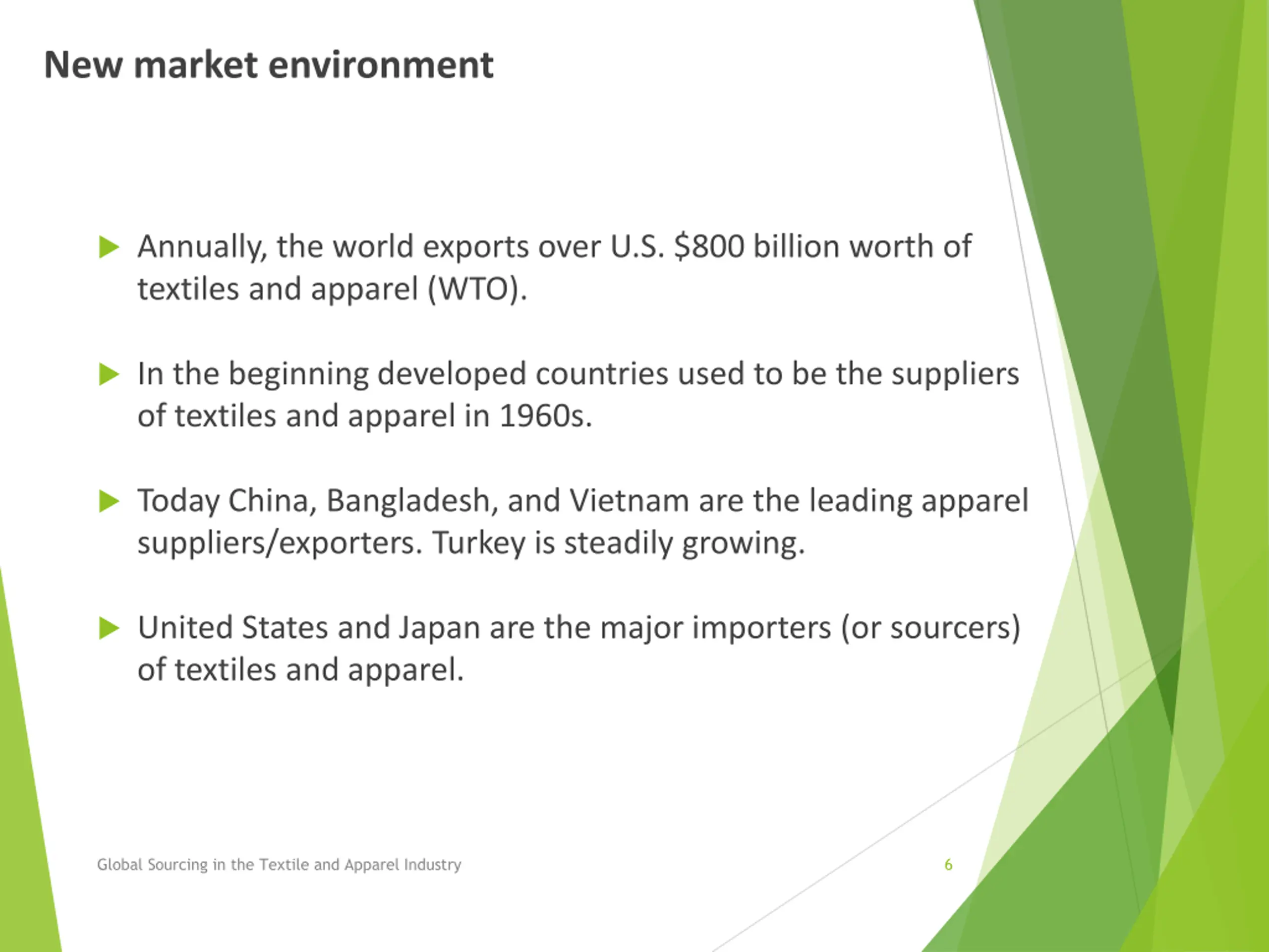 New market environment Annually, the world exports over U.S. $800 billion worth of textiles and apparel (WTO). In the beginning developed countries used to be the suppliers of textiles and apparel in 1960s. Today China, Bangladesh, and Vietnam are the leading apparel suppliers/exporters. Turkey is steadily growing. United States and Japan are the major importers (or sourcers) of textiles and apparel. Global Sourcing in the Textile and Apparel Industry 6