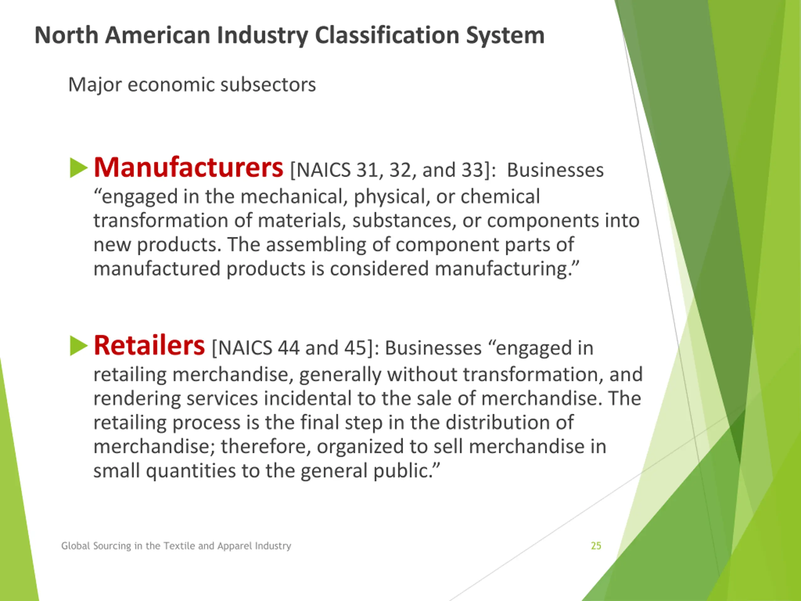 North American Industry Classification System Major economic subsectors Manufacturers [NAICS 31, 32, and 33]: Businesses engaged in the mechanical, physical, or chemical transformation of materials, substances, or components into new products. The assembling of component parts of manufactured products is considered manufacturing. Retailers[NAICS 44 and 45]: Businesses engaged in retailing merchandise, generally without transformation, and rendering services incidental to the sale of merchandise. The retailing process is the final step in the distribution of merchandise; therefore, organized to sell merchandise in small quantities to the general public. Global Sourcing in the Textile and Apparel Industry 25