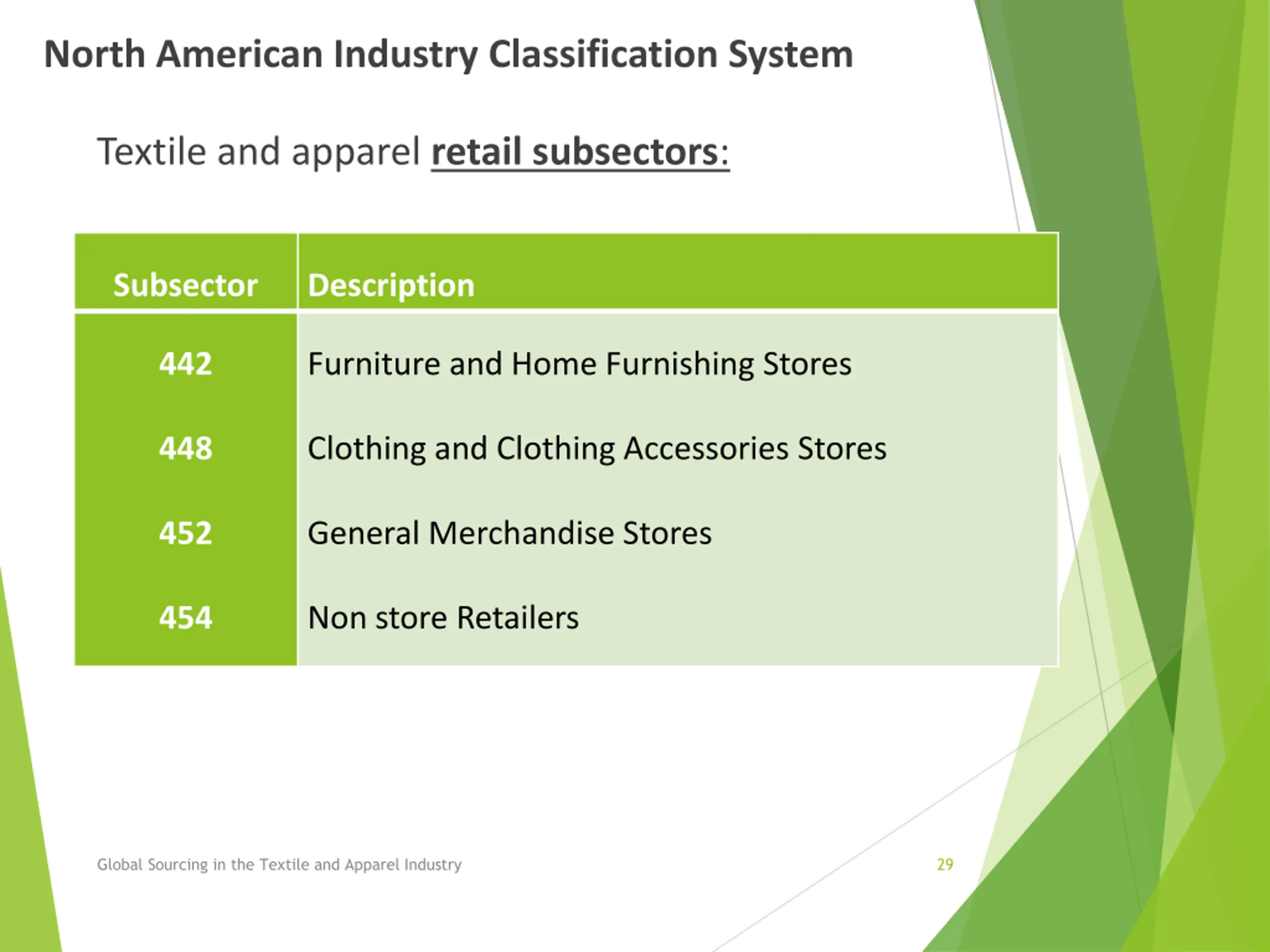 North American Industry Classification System Textile and apparel retail subsectors: Subsector Description 442 Furniture and Home Furnishing Stores 448 Clothing and Clothing Accessories Stores 452 General Merchandise Stores 454 Non store Retailers Global Sourcing in the Textile and Apparel Industry 29