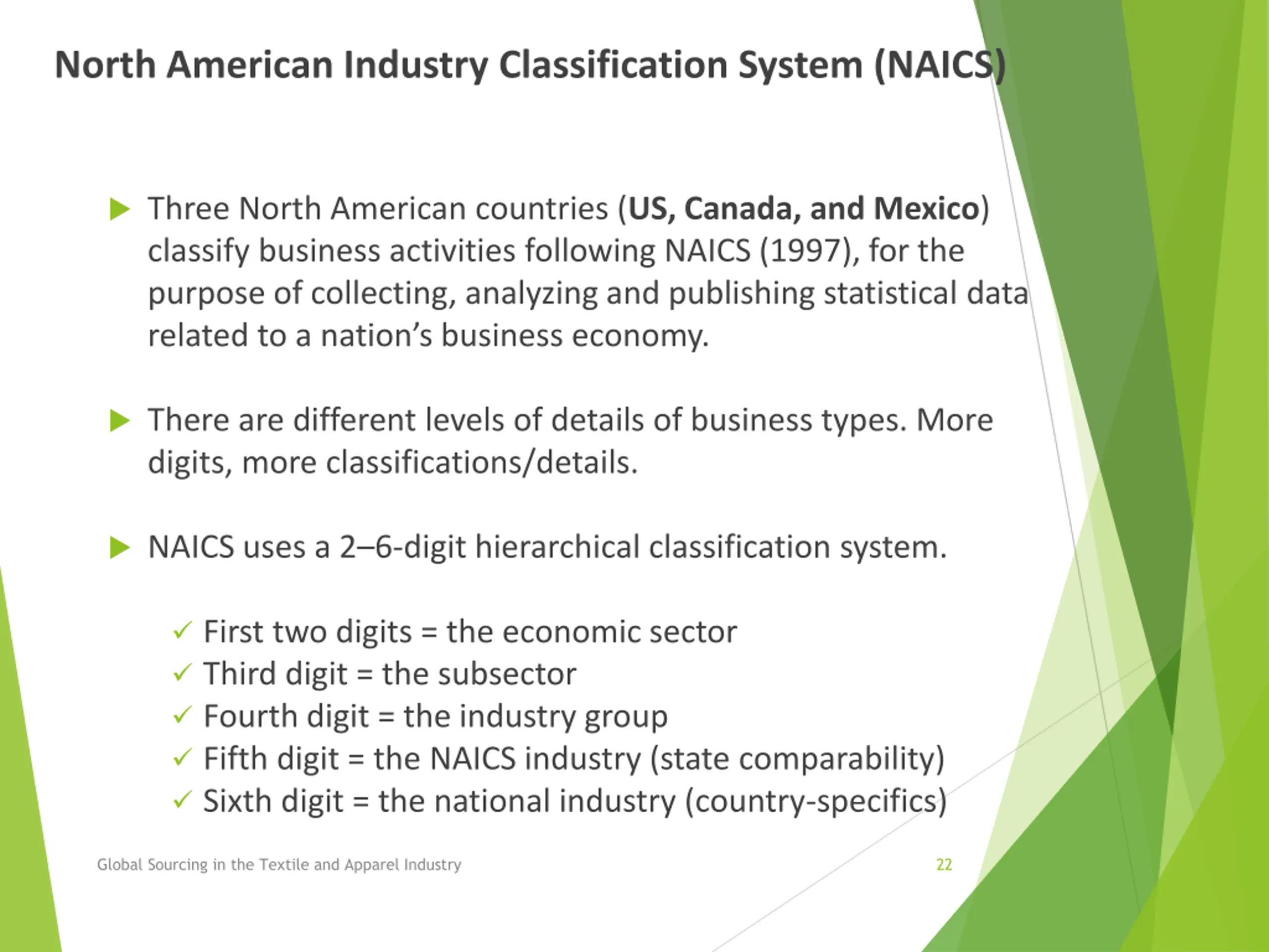 North American Industry Classification System (NAICS) Three North American countries (US, Canada, and Mexico) classify business activities following NAICS (1997), for the purpose of collecting, analyzing and publishing statistical data related to a nation s business economy. There are different levels of details of business types. More digits, more classifications/details. NAICS uses a 2 6-digit hierarchical classification system. First two digits = the economic sector Third digit = the subsector Fourth digit = the industry group Fifth digit = the NAICS industry (state comparability) Sixth digit = the national industry (country-specifics) Global Sourcing in the Textile and Apparel Industry 22