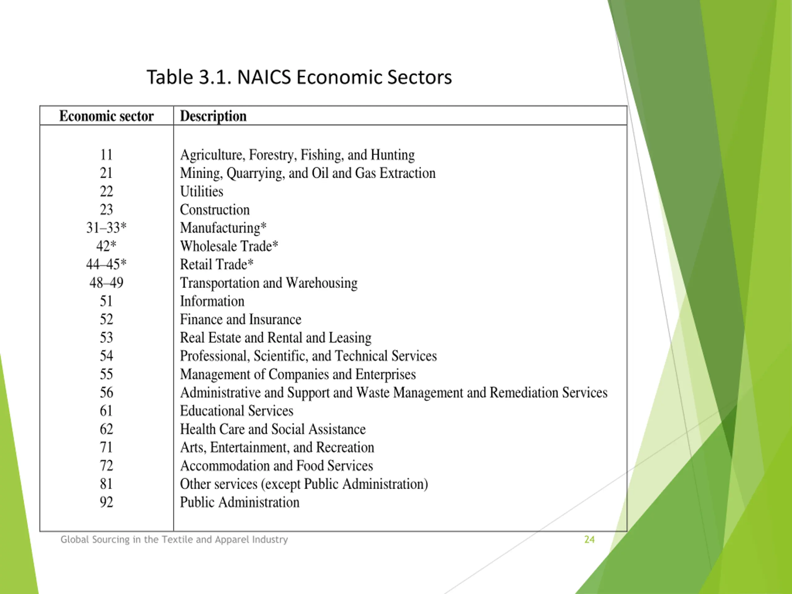 North American Industry Classification System (NAICS) Major economic subsectors There are 20 major economic sectors within NAICS. The first two digits explain the economic sector to which a business belongs. Most businesses in the textile and apparel industry belong to (a) manufacturing [31 33 economic sector] (b) wholesale trade [42 economic sector] (c) retail trade [44 45 economic sector] Global Sourcing in the Textile and Apparel Industry 23