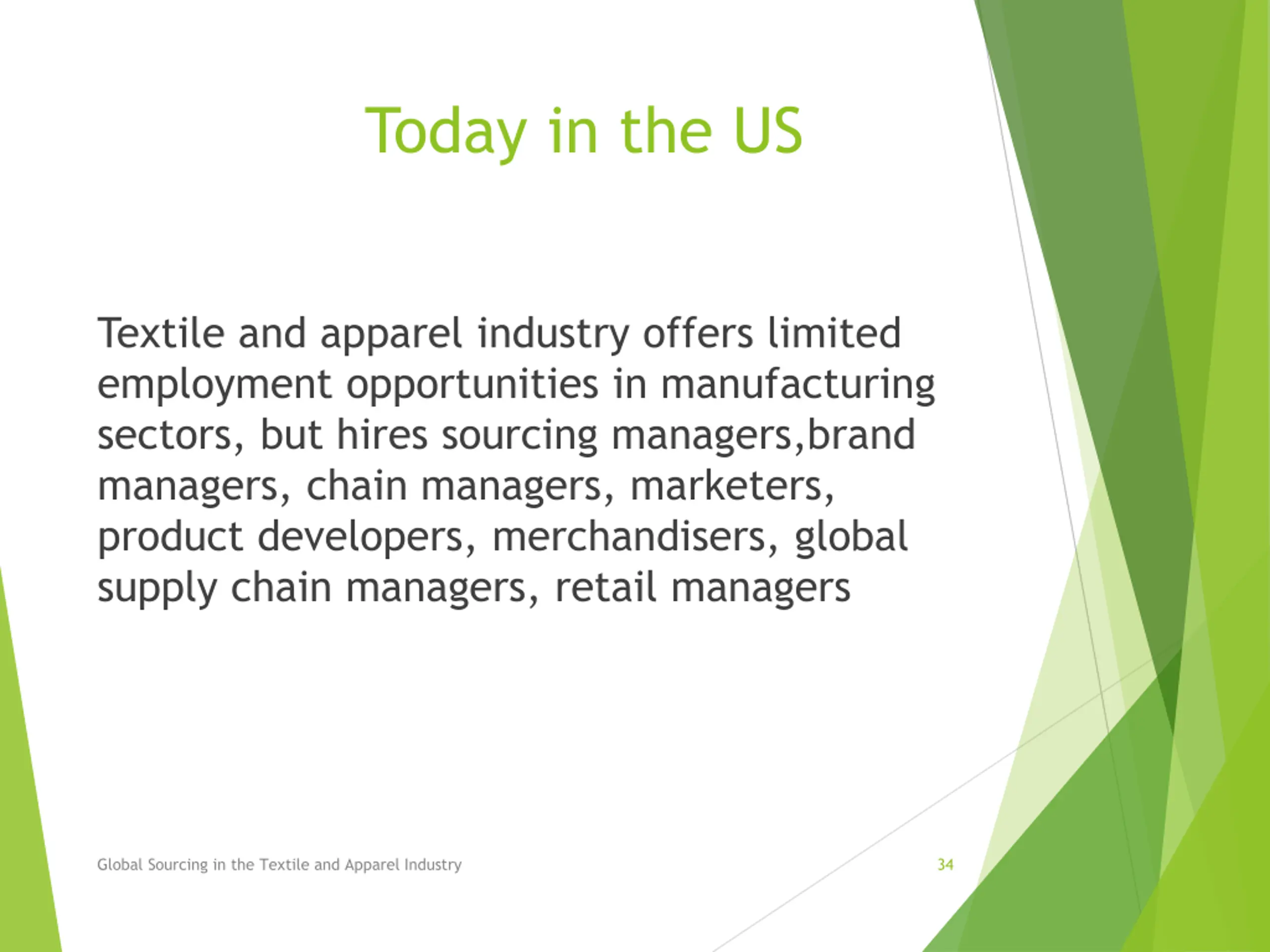 Today in the US Textile and apparel industry offers limited employment opportunities in manufacturing sectors, but hires sourcing managers,brand managers, chain managers, marketers, product developers, merchandisers, global supply chain managers, retail managers Global Sourcing in the Textile and Apparel Industry 34
