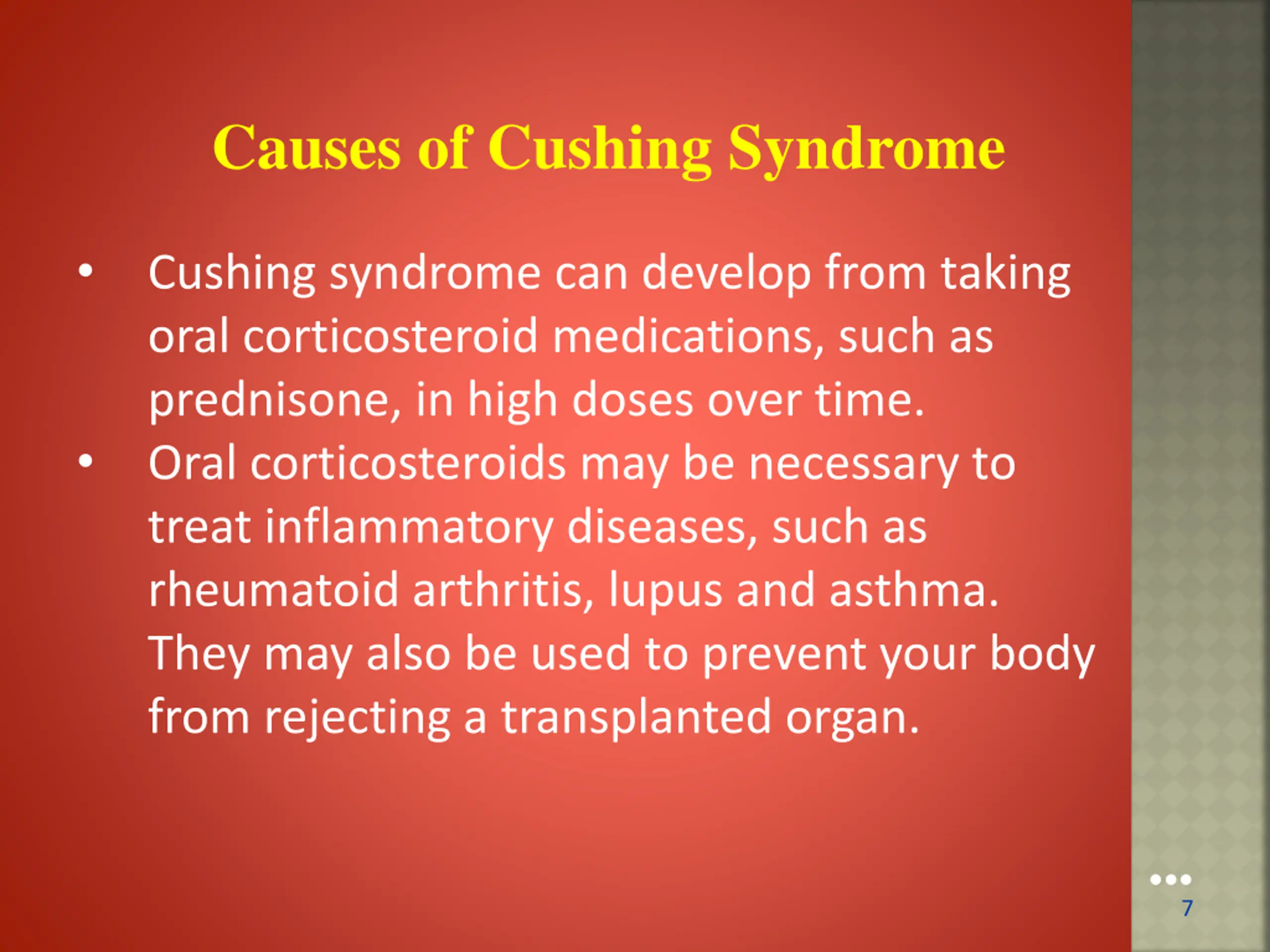 Causes of Cushing Syndrome Cushing syndrome can develop from taking oral corticosteroid medications, such as prednisone, in high doses over time. Oral corticosteroids may be necessary to treat inflammatory diseases, such as rheumatoid arthritis, lupus and asthma. They may also be used to prevent your body from rejecting a transplanted organ. 7
