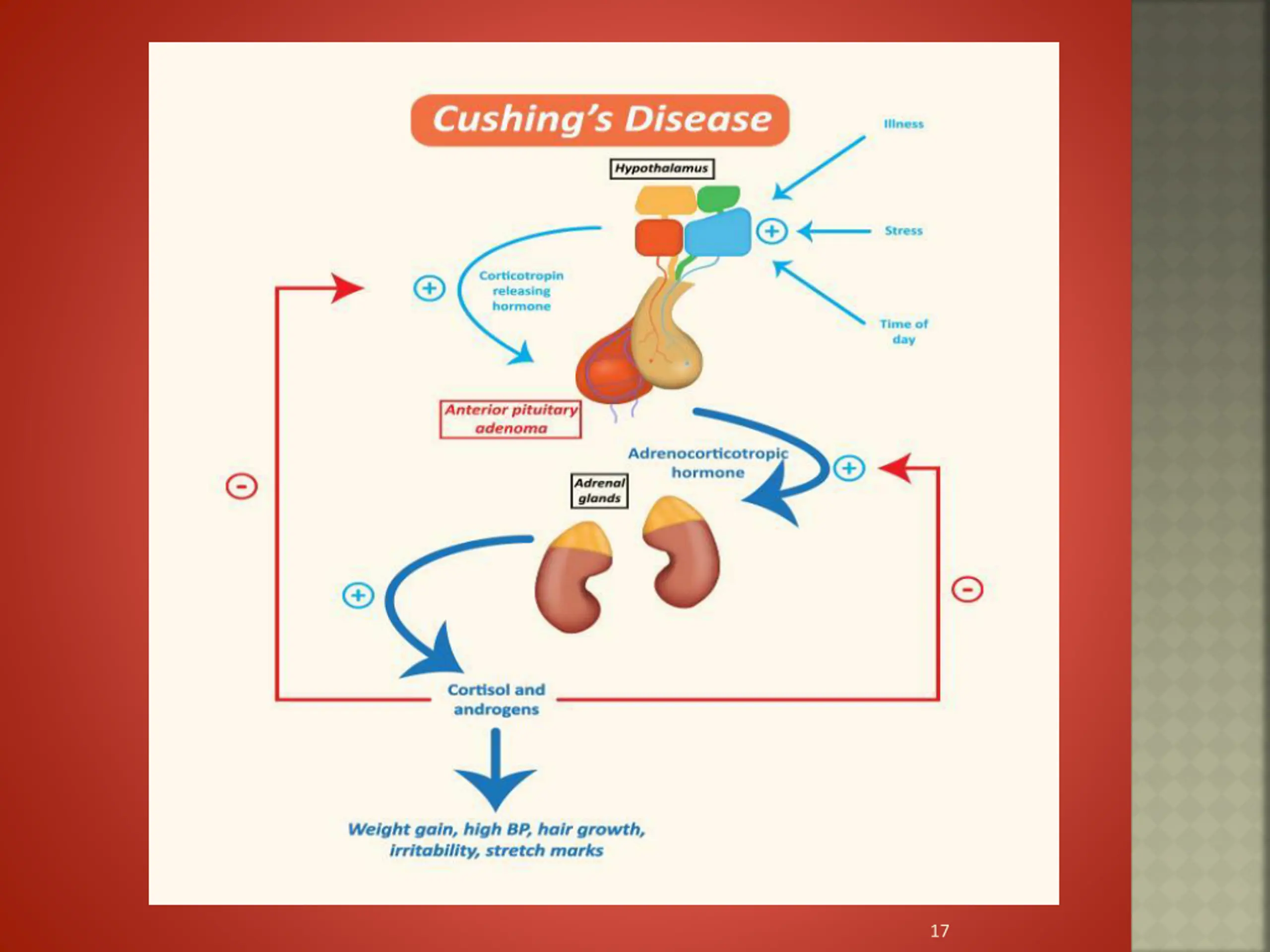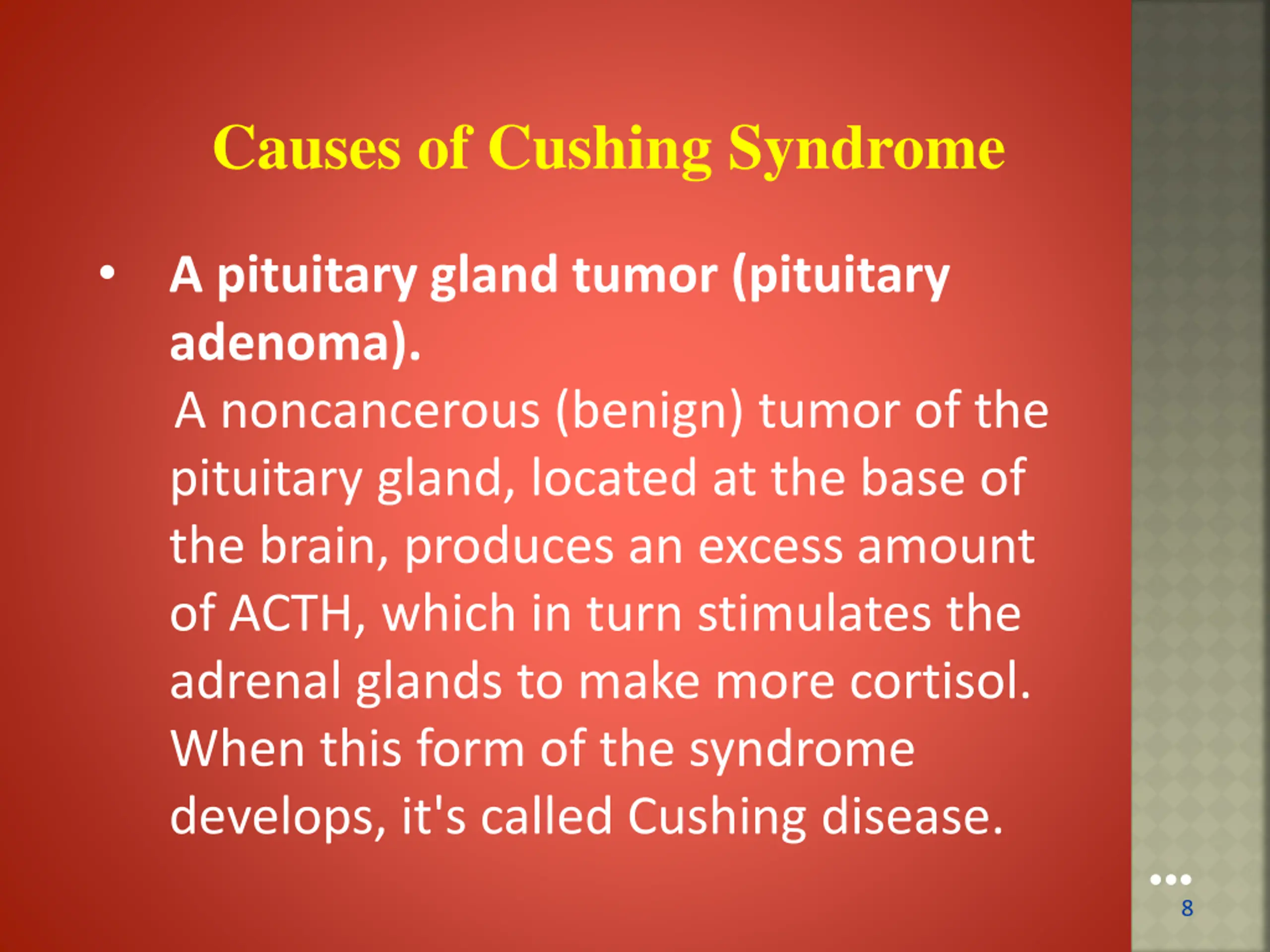 Causes of Cushing Syndrome A pituitary gland tumor (pituitary adenoma). A noncancerous (benign) tumor of the pituitary gland, located at the base of the brain, produces an excess amount of ACTH, which in turn stimulates the adrenal glands to make more cortisol. When this form of the syndrome develops, it's called Cushing disease. 8