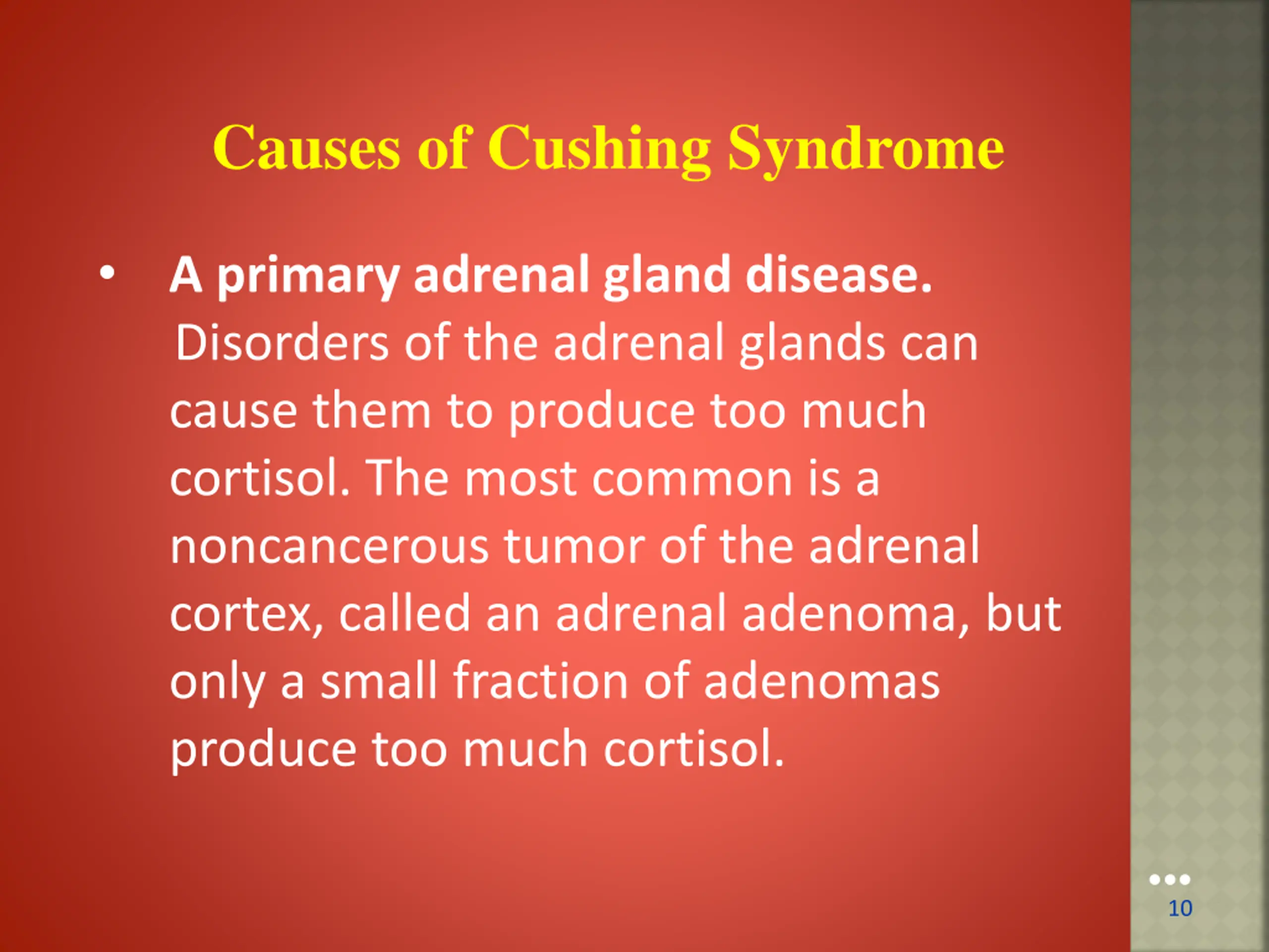 Causes of Cushing Syndrome Disorders of the adrenal glands can cause them to produce too much cortisol. The most common is a noncancerous tumor of the adrenal cortex, called an adrenal adenoma, but only a small fraction of adenomas produce too much cortisol. A primary adrenal gland disease. 10