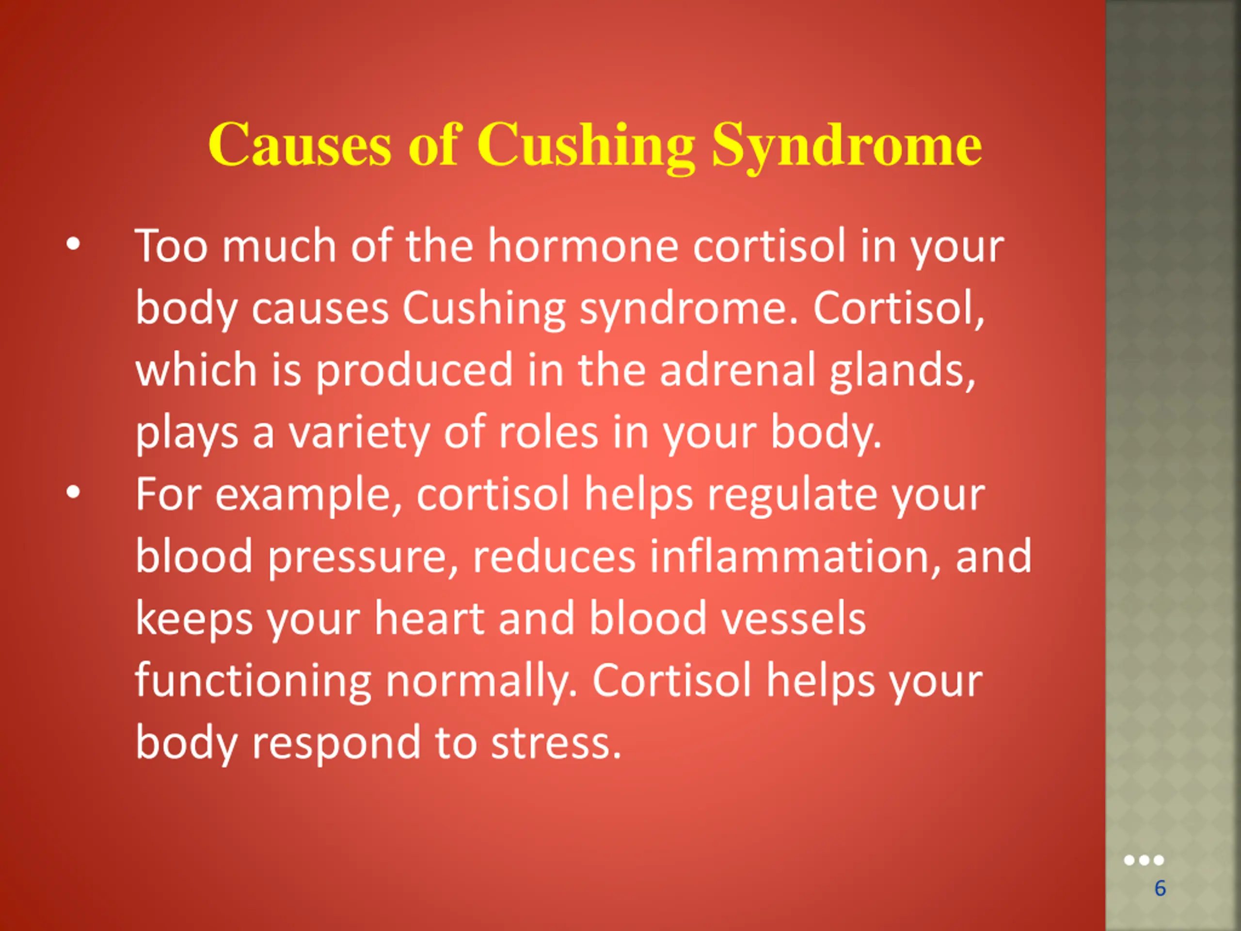Causes of Cushing Syndrome Too much of the hormone cortisol in your body causes Cushing syndrome. Cortisol, which is produced in the adrenal glands, plays a variety of roles in your body. For example, cortisol helps regulate your blood pressure, reduces inflammation, and keeps your heart and blood vessels functioning normally. Cortisol helps your body respond to stress. 6
