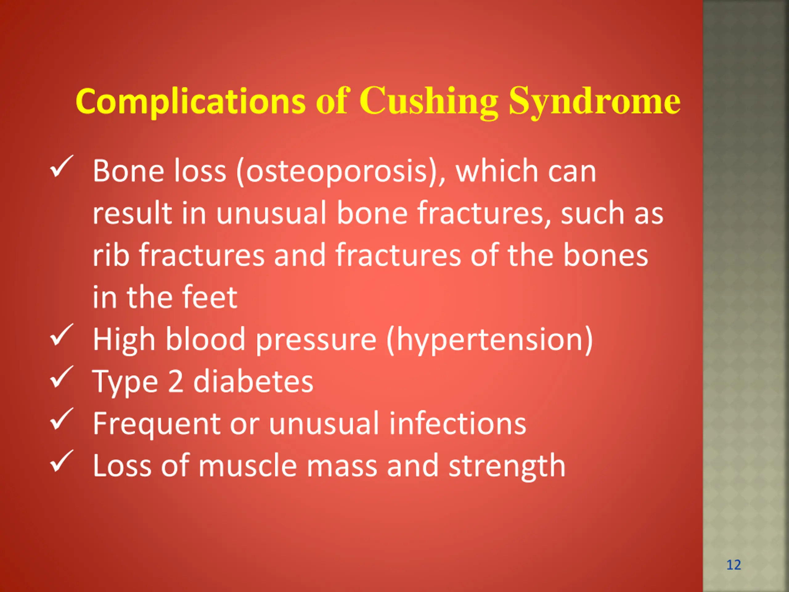 Complicationsof Cushing Syndrome Bone loss (osteoporosis), which can result in unusual bone fractures, such as rib fractures and fractures of the bones in the feet High blood pressure (hypertension) Type 2 diabetes Frequent or unusual infections Loss of muscle mass and strength 12