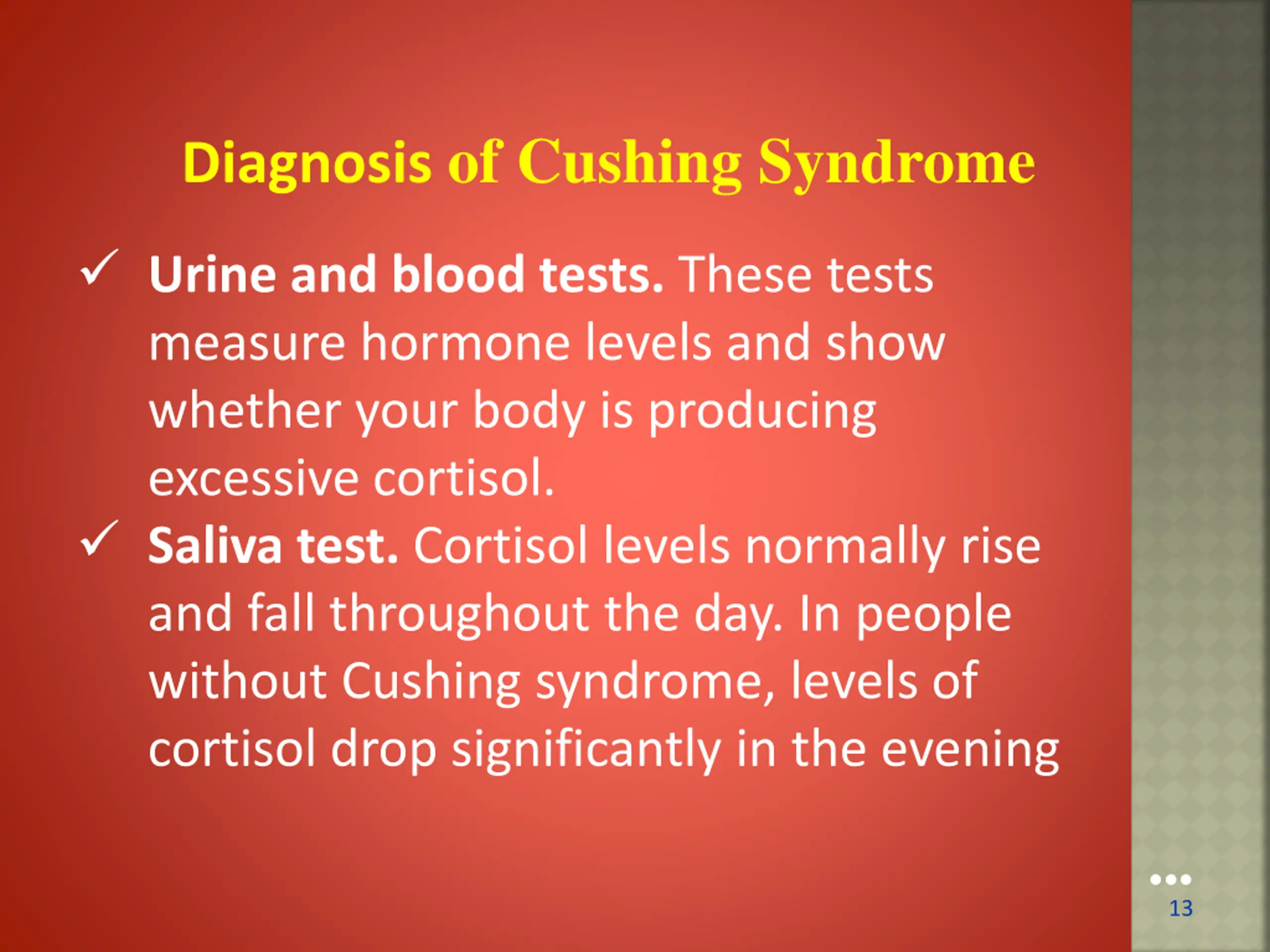 Diagnosis of Cushing Syndrome Urine and blood tests. These tests measure hormone levels and show whether your body is producing excessive cortisol. Saliva test. Cortisol levels normally rise and fall throughout the day. In people without Cushing syndrome, levels of cortisol drop significantly in the evening 13
