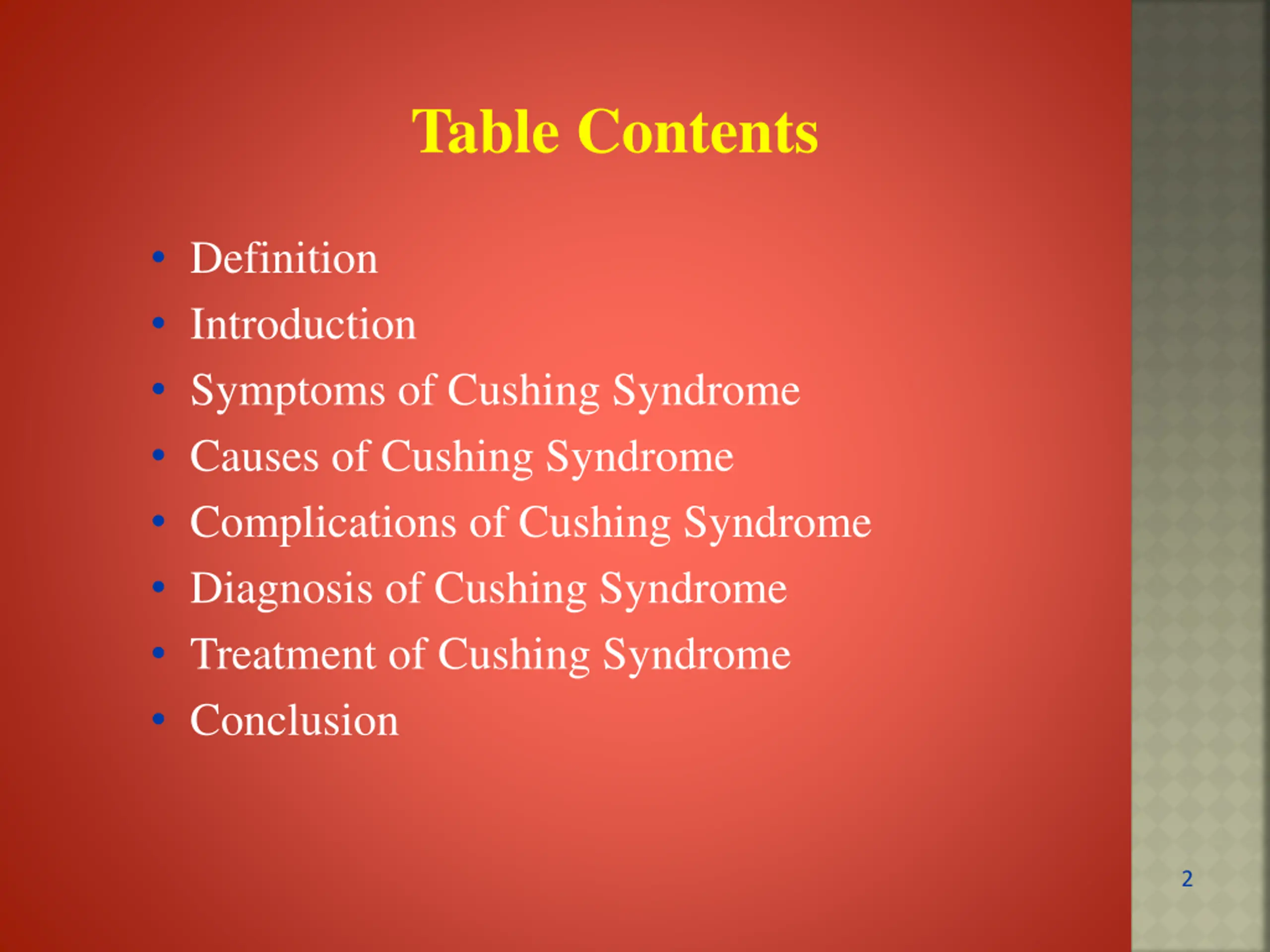 Table Contents Definition Introduction Symptoms of Cushing Syndrome Causes of Cushing Syndrome Complications of Cushing Syndrome Diagnosis of Cushing Syndrome Treatment of Cushing Syndrome Conclusion 2