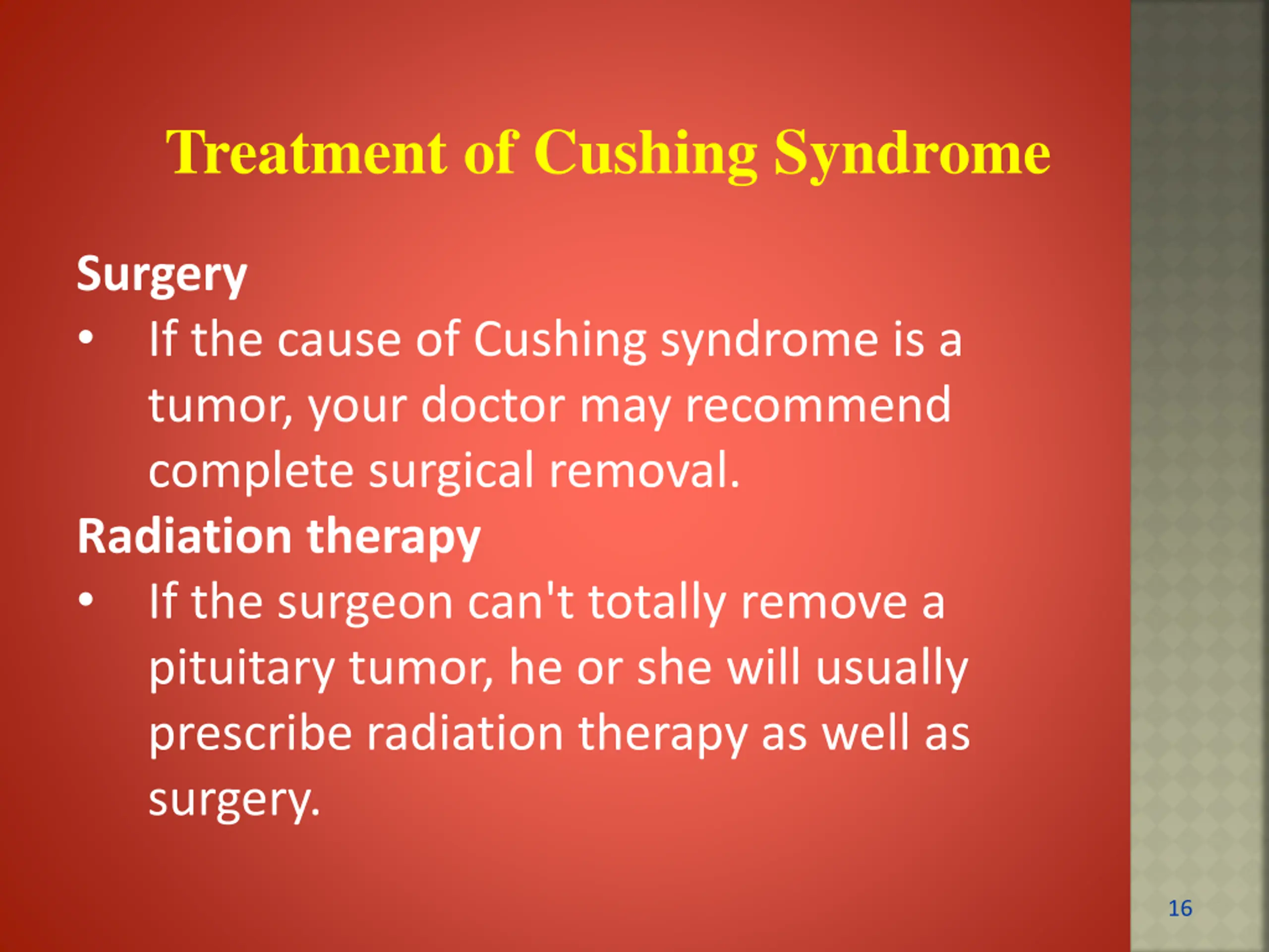 Treatment of Cushing Syndrome Surgery If the cause of Cushing syndrome is a tumor, your doctor may recommend complete surgical removal. Radiation therapy If the surgeon can't totally remove a pituitary tumor, he or she will usually prescribe radiation therapy as well as surgery. 16