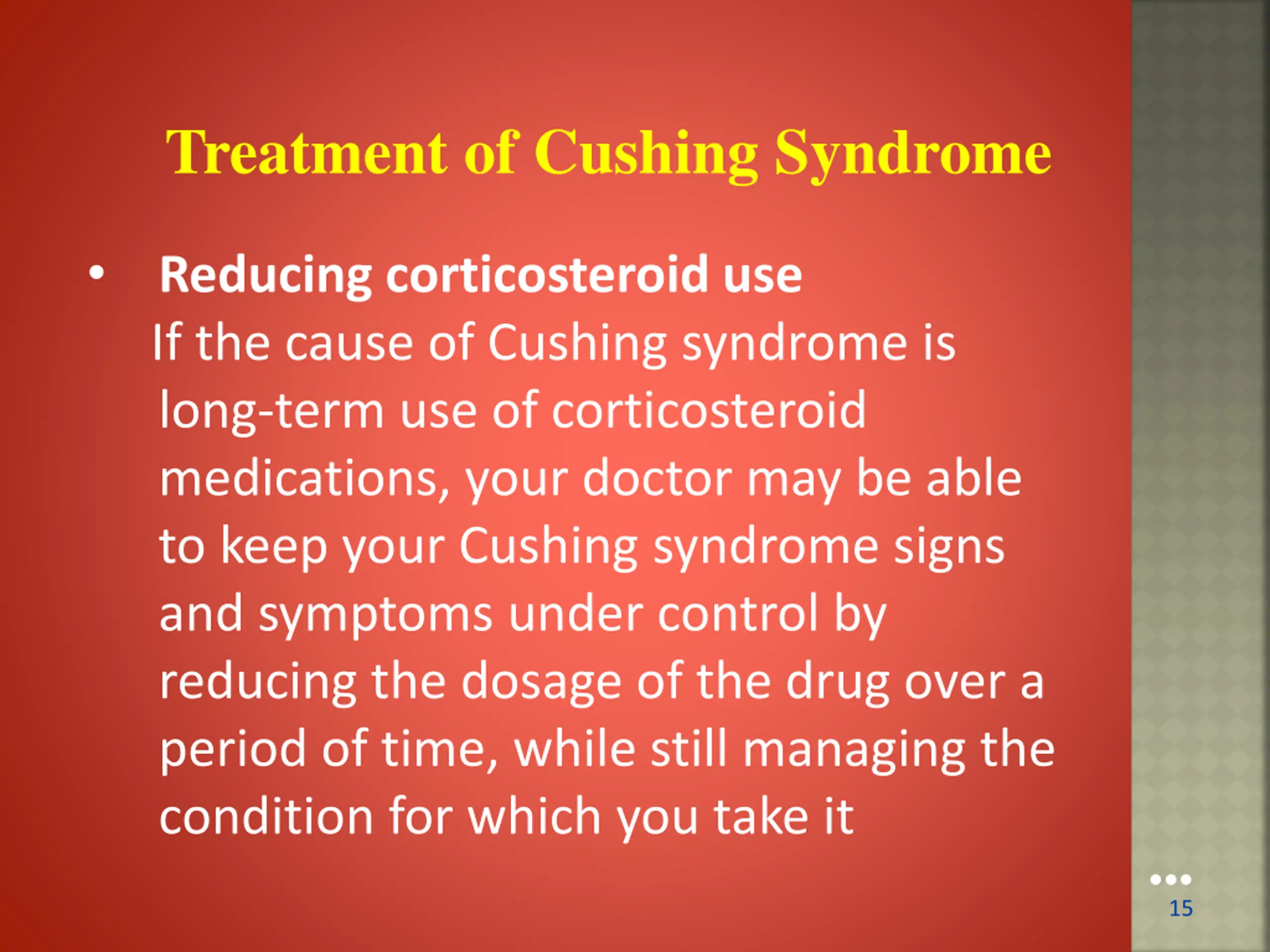 Treatment of Cushing Syndrome If the cause of Cushing syndrome is long-term use of corticosteroid medications, your doctor may be able to keep your Cushing syndrome signs and symptoms under control by reducing the dosage of the drug over a period of time, while still managing the condition for which you take it Reducing corticosteroid use 15