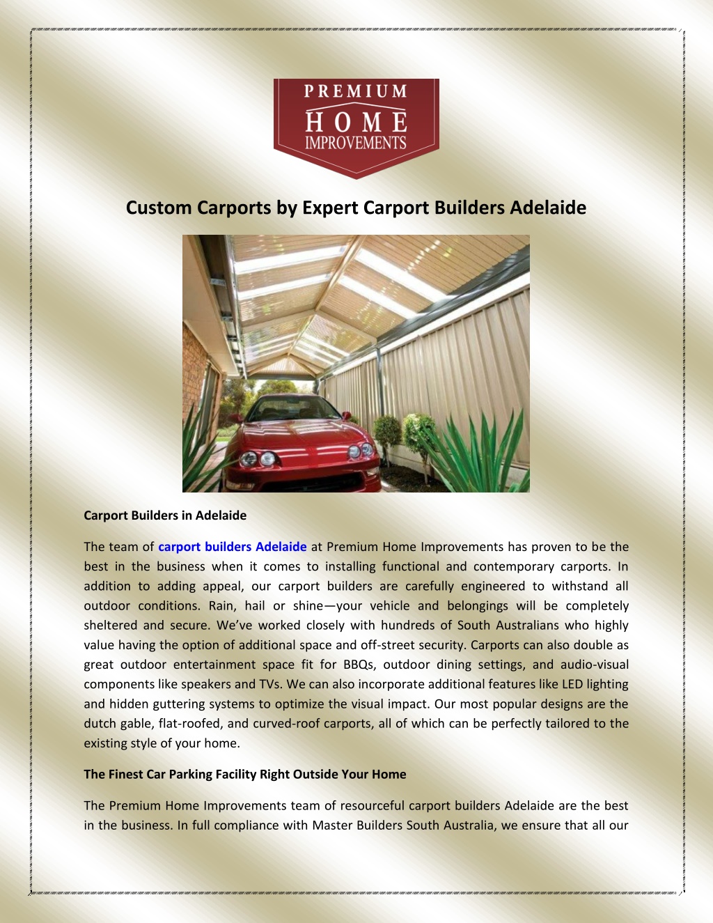 Custom Carports by Expert Carport Builders Adelaide Carport Builders in Adelaide The team of carport builders Adelaide at Premium Home Improvements has proven to be the best in the business when it comes to installing functional and contemporary carports. In addition to adding appeal, our carport builders are carefully engineered to withstand all outdoor conditions. Rain, hail or shine your vehicle and belongings will be completely sheltered and secure. We ve worked closely with hundreds of South Australians who highly value having the option of additional space and off-street security. Carports can also double as great outdoor entertainment space fit for BBQs, outdoor dining settings, and audio-visual components like speakers and TVs. We can also incorporate additional features like LED lighting and hidden guttering systems to optimize the visual impact. Our most popular designs are the dutch gable, flat-roofed, and curved-roof carports, all of which can be perfectly tailored to the existing style of your home. The Finest Car Parking Facility Right Outside Your Home The Premium Home Improvements team of resourceful carport builders Adelaide are the best in the business. In full compliance with Master Builders South Australia, we ensure that all our