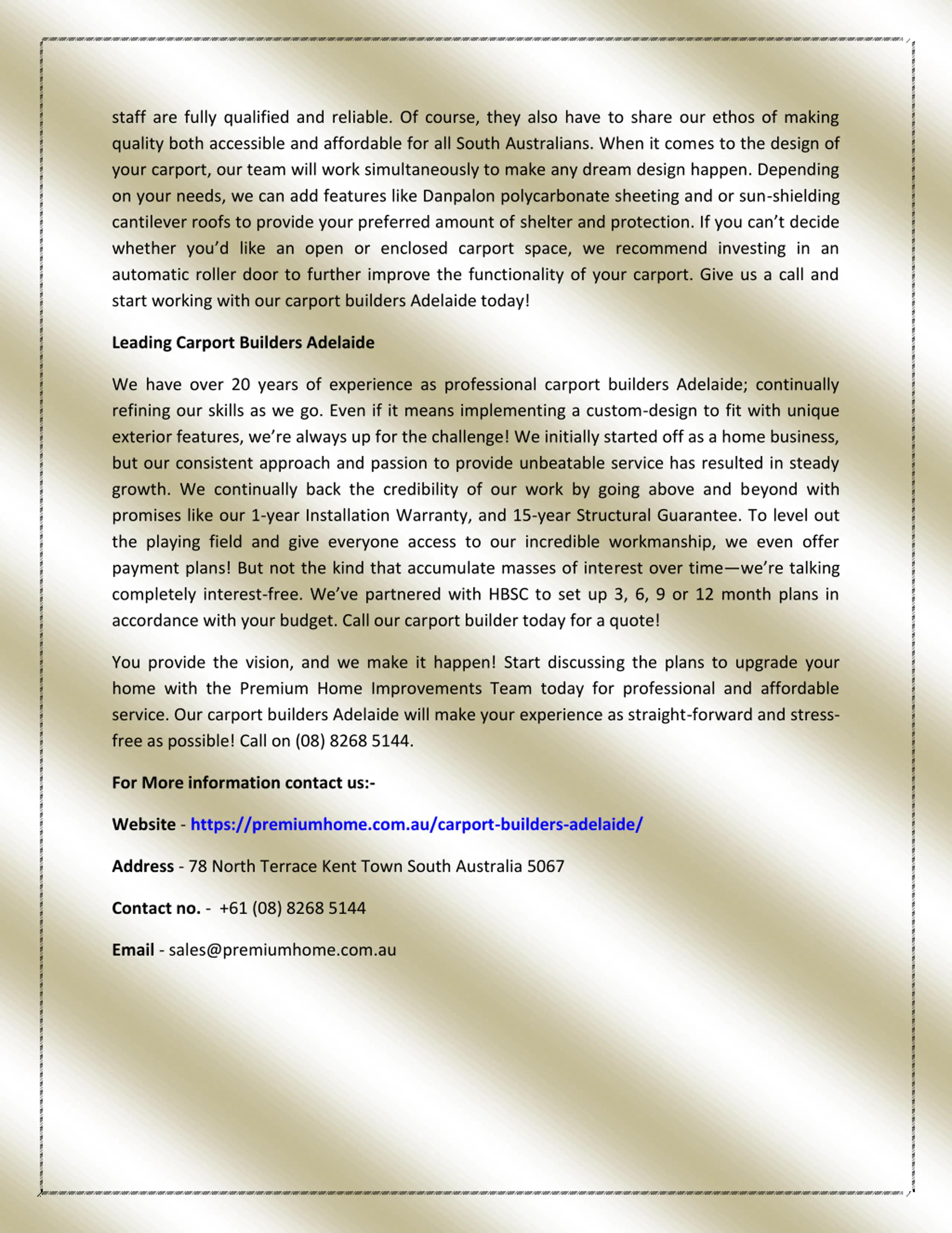 staff are fully qualified and reliable. Of course, they also have to share our ethos of making quality both accessible and affordable for all South Australians. When it comes to the design of your carport, our team will work simultaneously to make any dream design happen. Depending on your needs, we can add features like Danpalon polycarbonate sheeting and or sun-shielding cantilever roofs to provide your preferred amount of shelter and protection. If you can t decide whether you d like an open or enclosed carport space, we recommend investing in an automatic roller door to further improve the functionality of your carport. Give us a call and start working with our carport builders Adelaide today! Leading Carport Builders Adelaide We have over 20 years of experience as professional carport builders Adelaide; continually refining our skills as we go. Even if it means implementing a custom-design to fit with unique exterior features, we re always up for the challenge! We initially started off as a home business, but our consistent approach and passion to provide unbeatable service has resulted in steady growth. We continually back the credibility of our work by going above and beyond with promises like our 1-year Installation Warranty, and 15-year Structural Guarantee. To level out the playing field and give everyone access to our incredible workmanship, we even offer payment plans! But not the kind that accumulate masses of interest over time we re talking completely interest-free. We ve partnered with HBSC to set up 3, 6, 9 or 12 month plans in accordance with your budget. Call our carport builder today for a quote! You provide the vision, and we make it happen! Start discussing the plans to upgrade your home with the Premium Home Improvements Team today for professional and affordable service. Our carport builders Adelaide will make your experience as straight-forward and stress- free as possible! Call on (08) 8268 5144. For More information contact us:- Website - https://premiumhome.com.au/carport-builders-adelaide/ Address - 78 North Terrace Kent Town South Australia 5067 Contact no. - +61 (08) 8268 5144 Email - sales@premiumhome.com.au