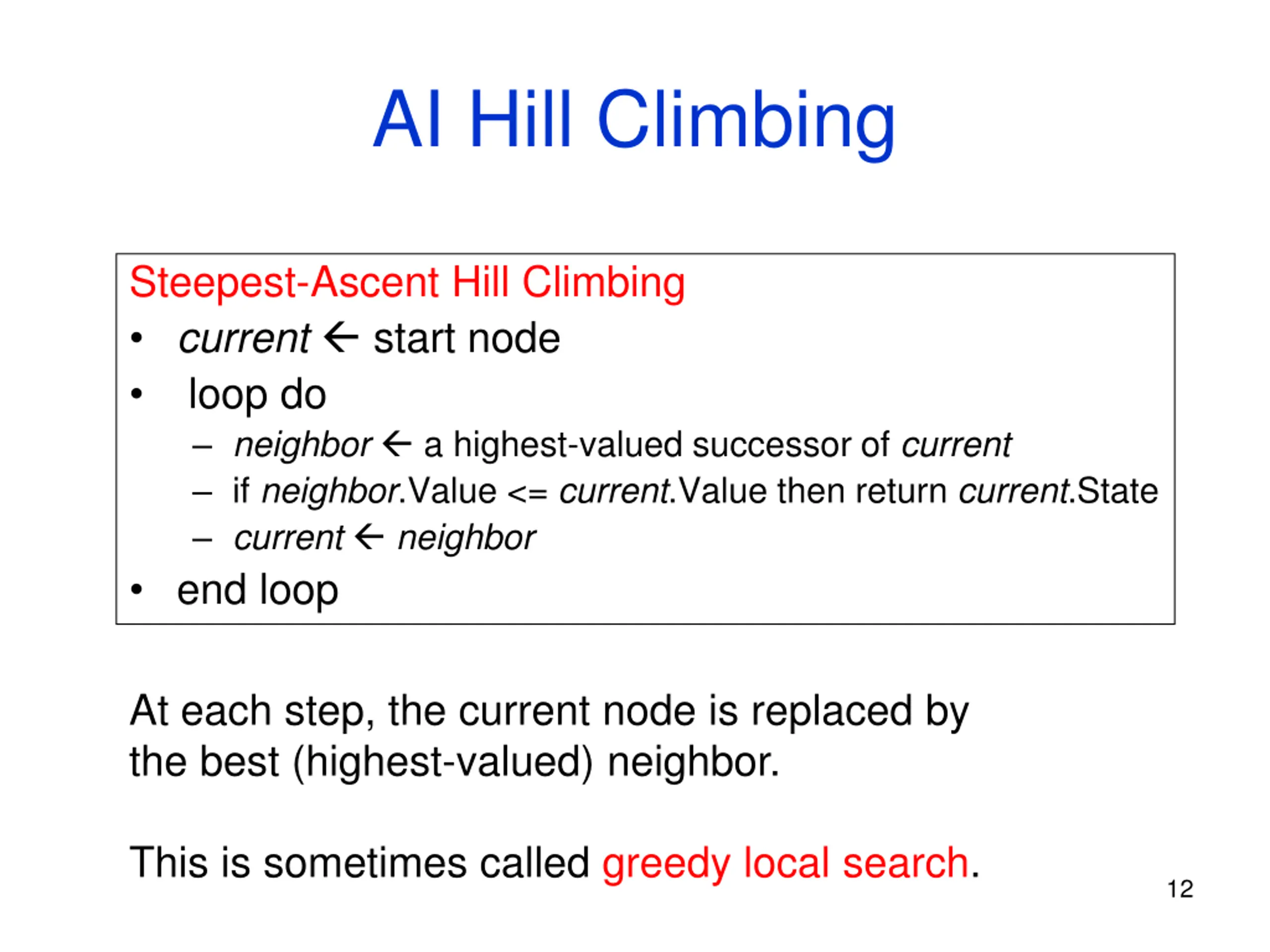 AI Hill Climbing Steepest-Ascent Hill Climbing current start node loop do neighbor a highest-valued successor of current if neighbor.Value <= current.Value then return current.State current neighbor end loop At each step, the current node is replaced by the best (highest-valued) neighbor. This is sometimes called greedy local search. 12