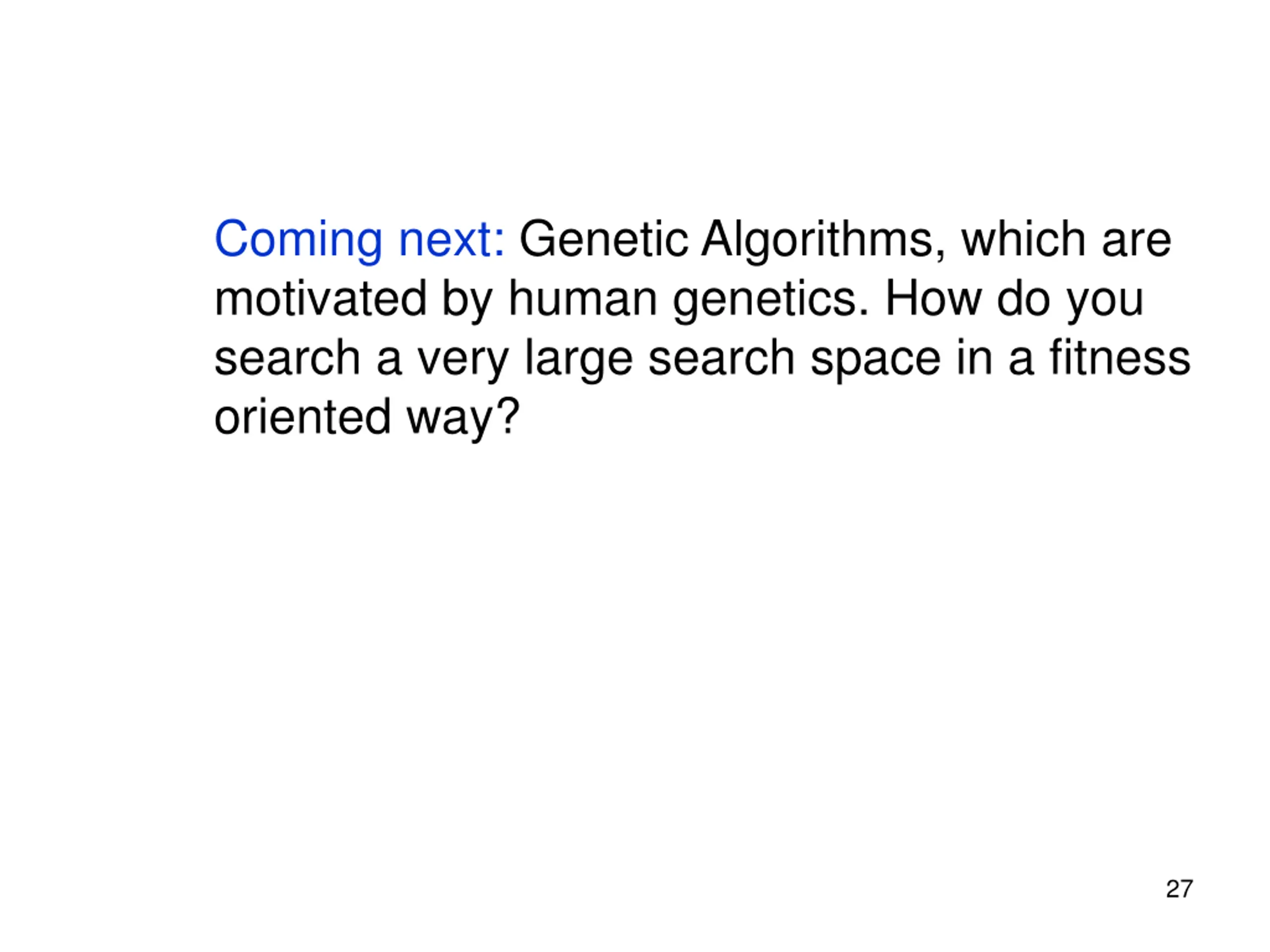 Coming next: Genetic Algorithms, which are motivated by human genetics. How do you search a very large search space in a fitness oriented way? 27