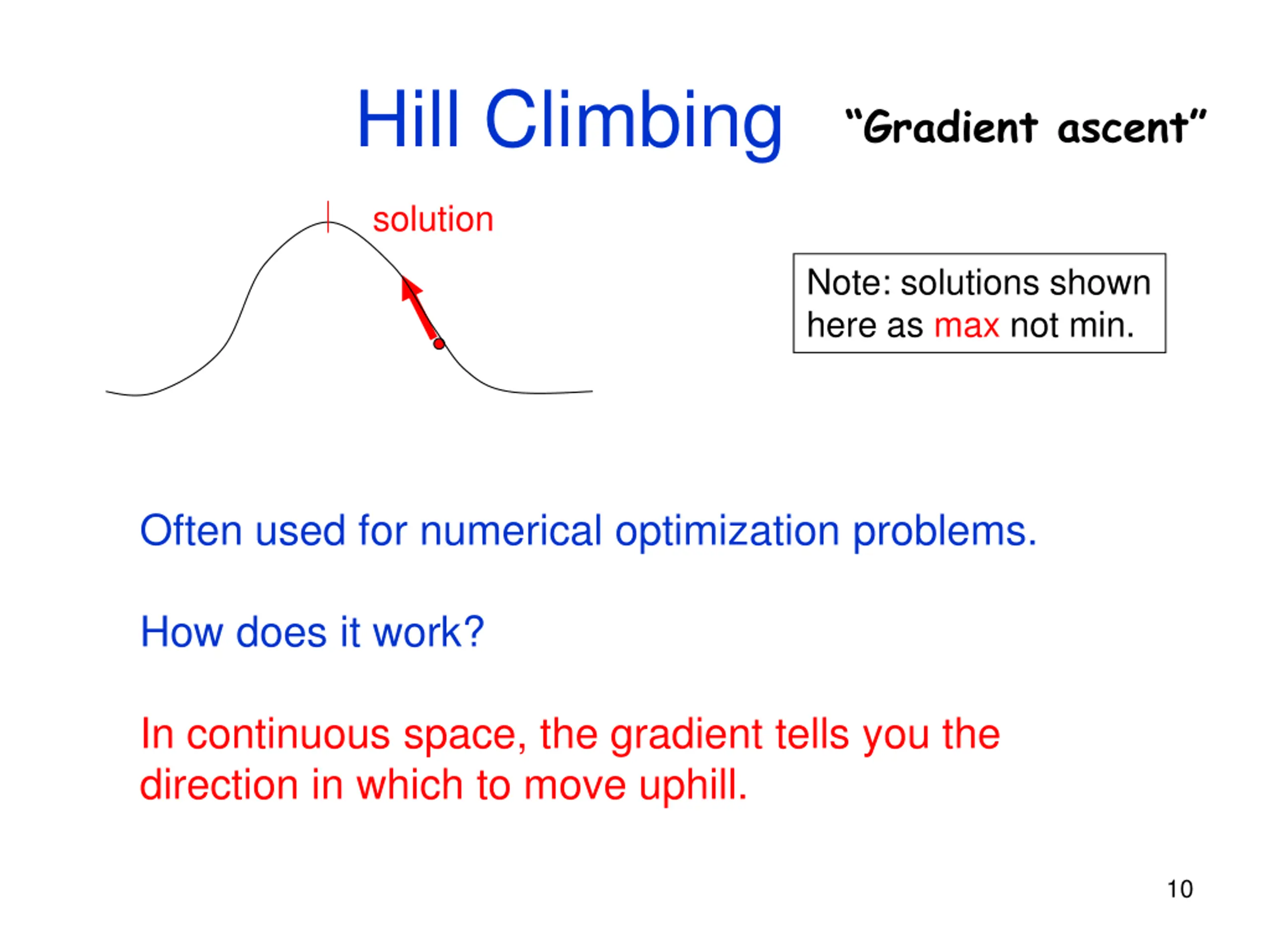 Hill Climbing Gradient ascent solution Note: solutions shown here as max not min. Often used for numerical optimization problems. How does it work? In continuous space, the gradient tells you the direction in which to move uphill. 10