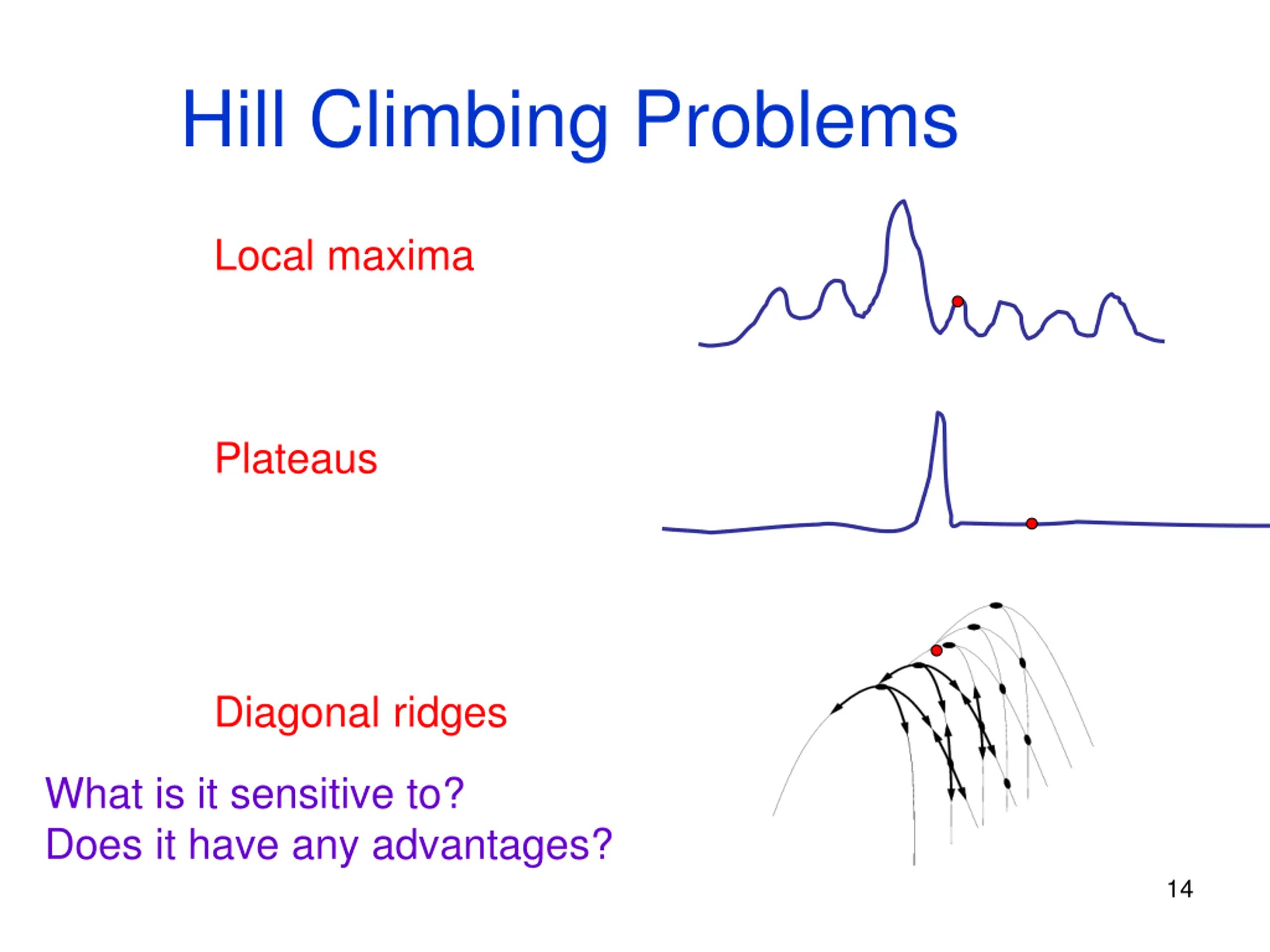 Hill Climbing Problems Local maxima Plateaus Diagonal ridges What is it sensitive to? Does it have any advantages? 14