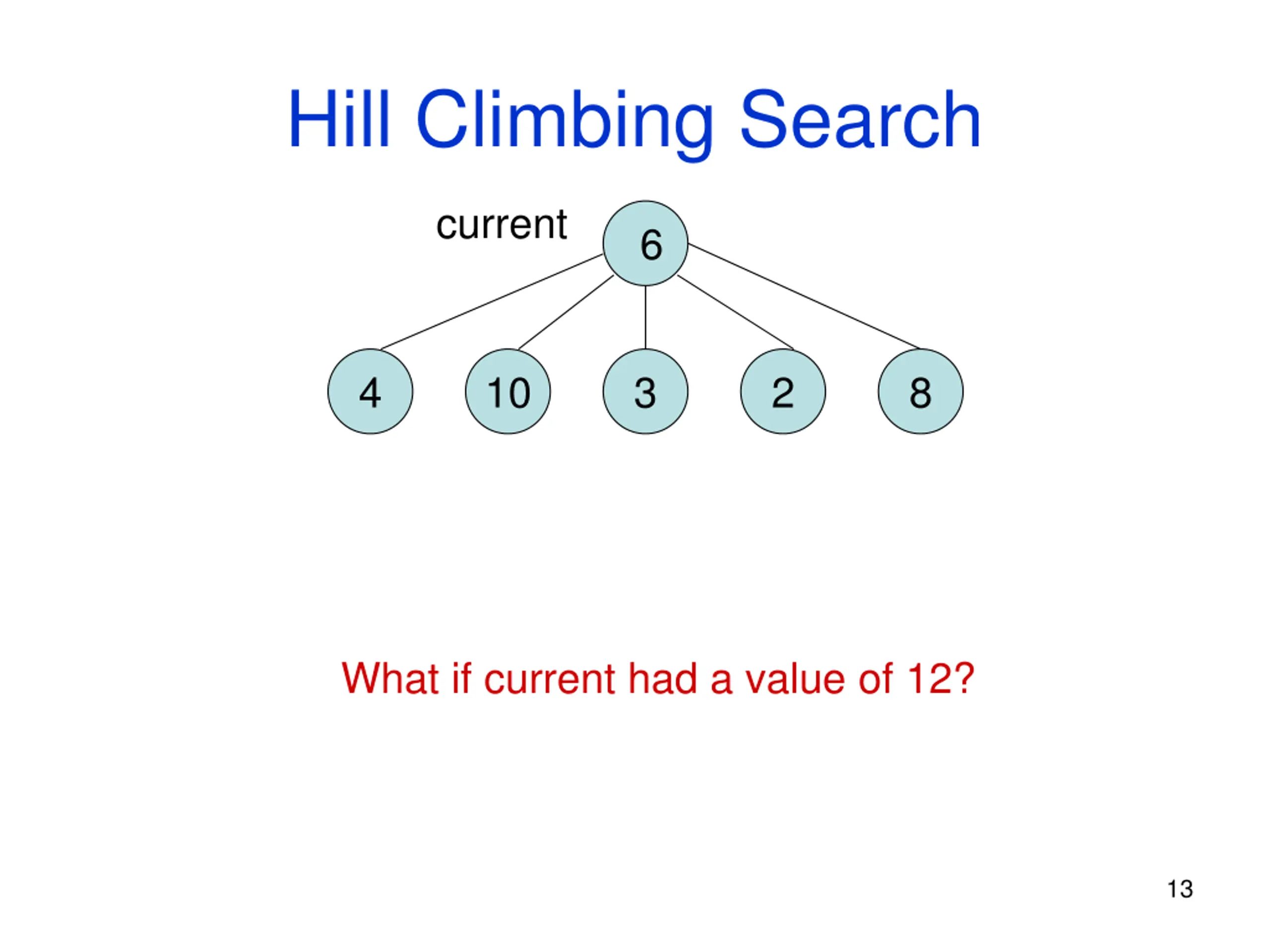 Hill Climbing Search current 6 4 10 3 2 8 What if current had a value of 12? 13