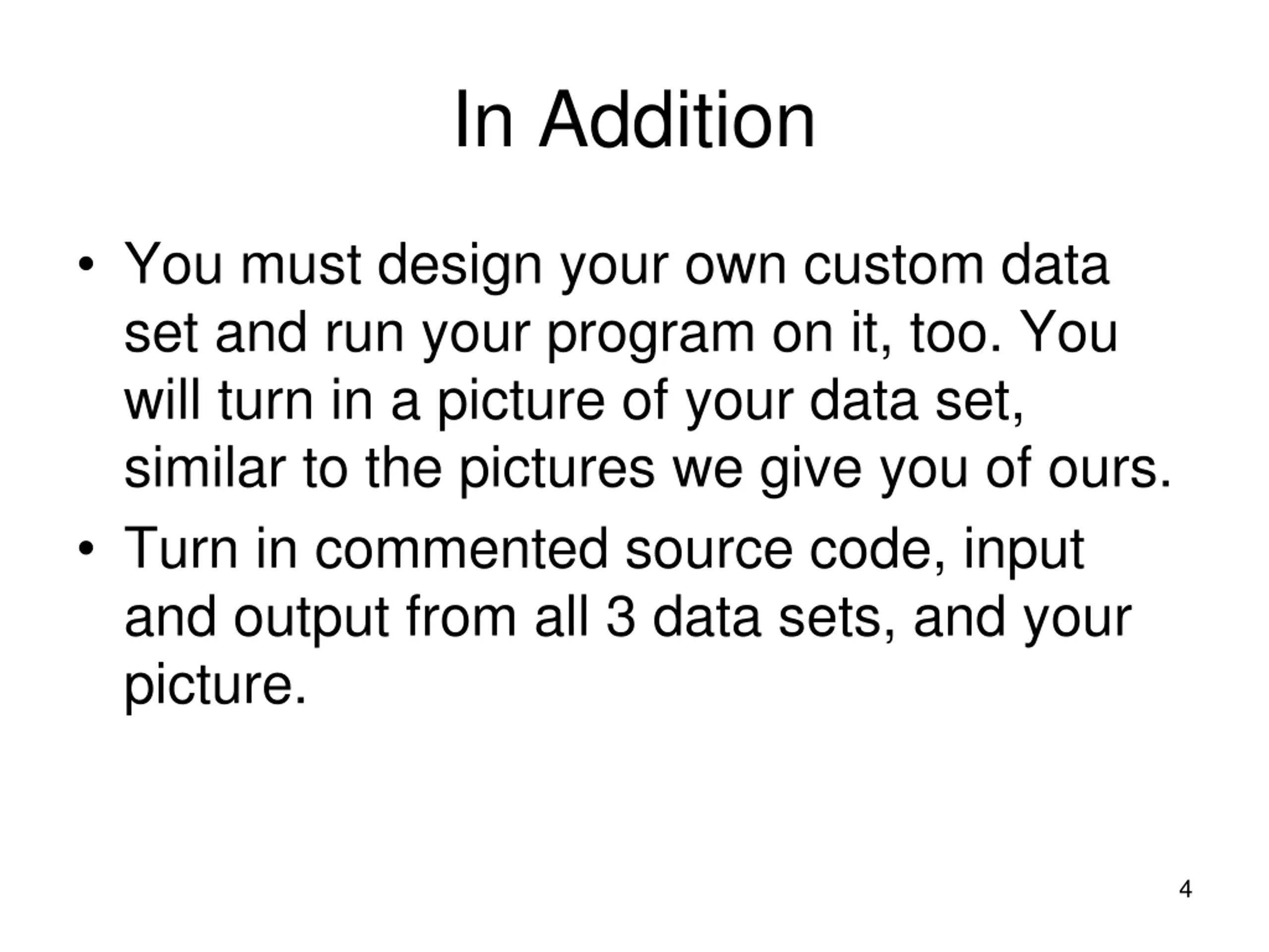 In Addition You must design your own custom data set and run your program on it, too. You will turn in a picture of your data set, similar to the pictures we give you of ours. Turn in commented source code, input and output from all 3 data sets, and your picture. 4