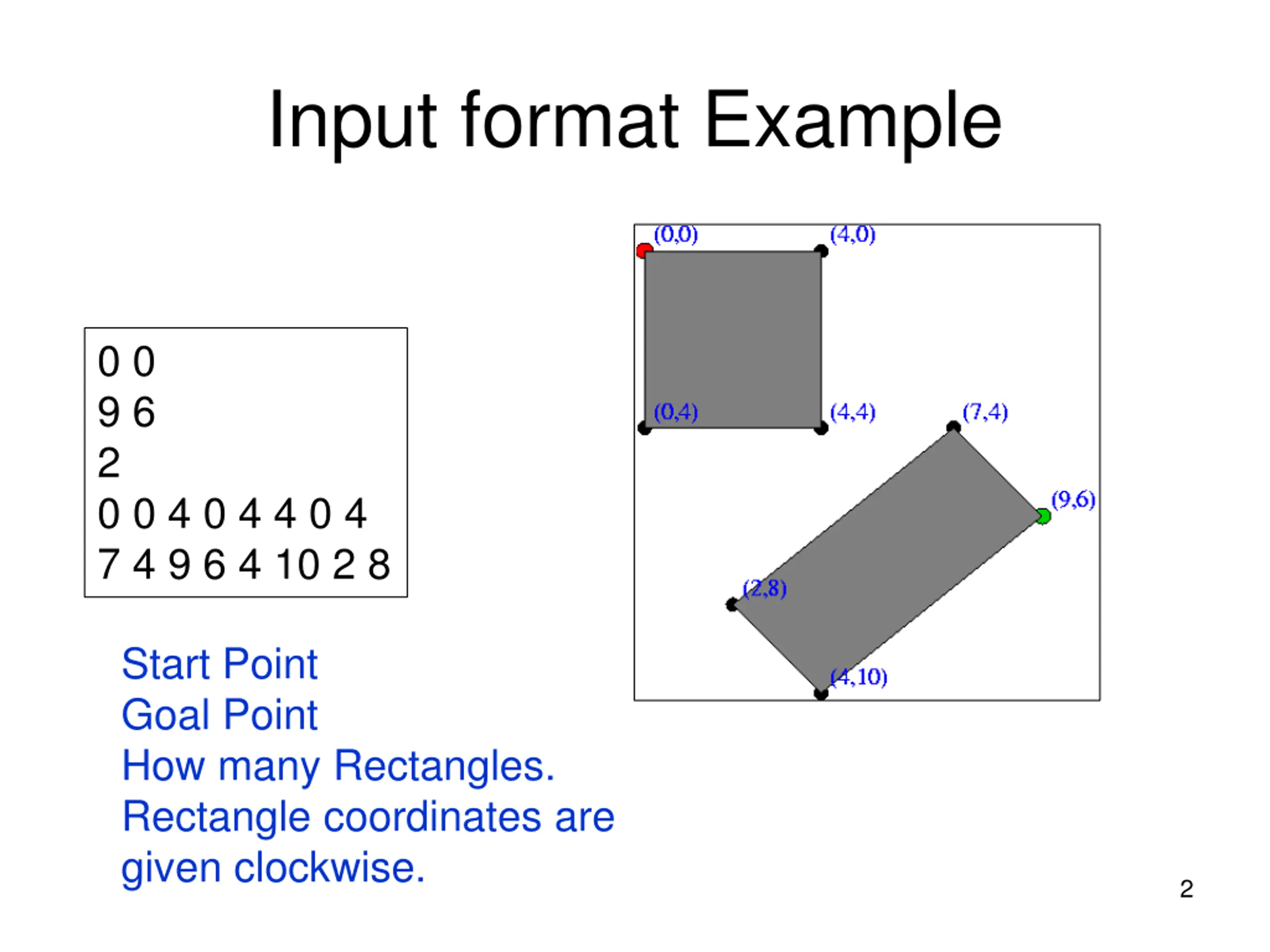 Input format Example 0 0 9 6 2 0 0 4 0 4 4 0 4 7 4 9 6 4 10 2 8 Start Point Goal Point How many Rectangles. Rectangle coordinates are given clockwise. 2