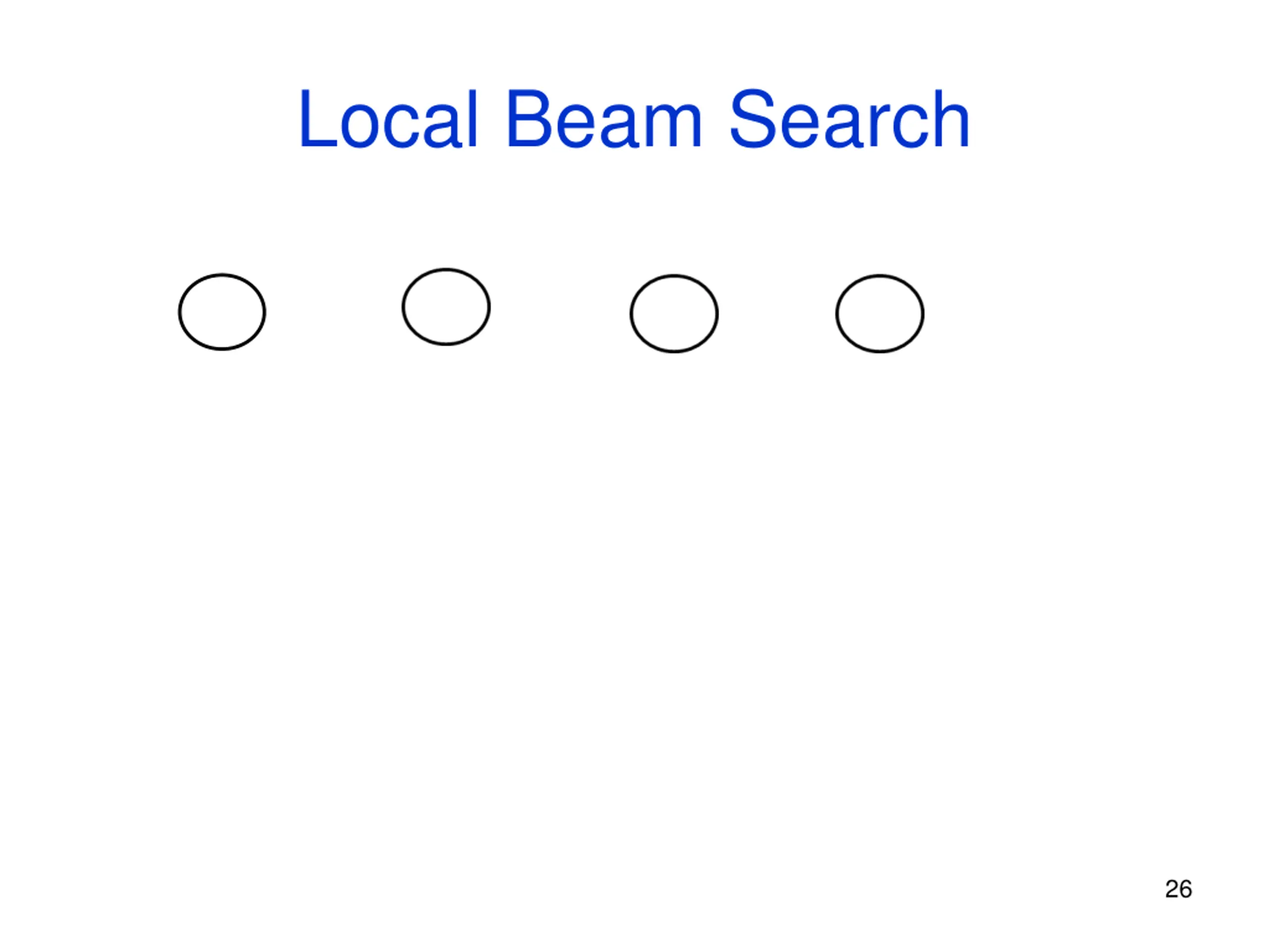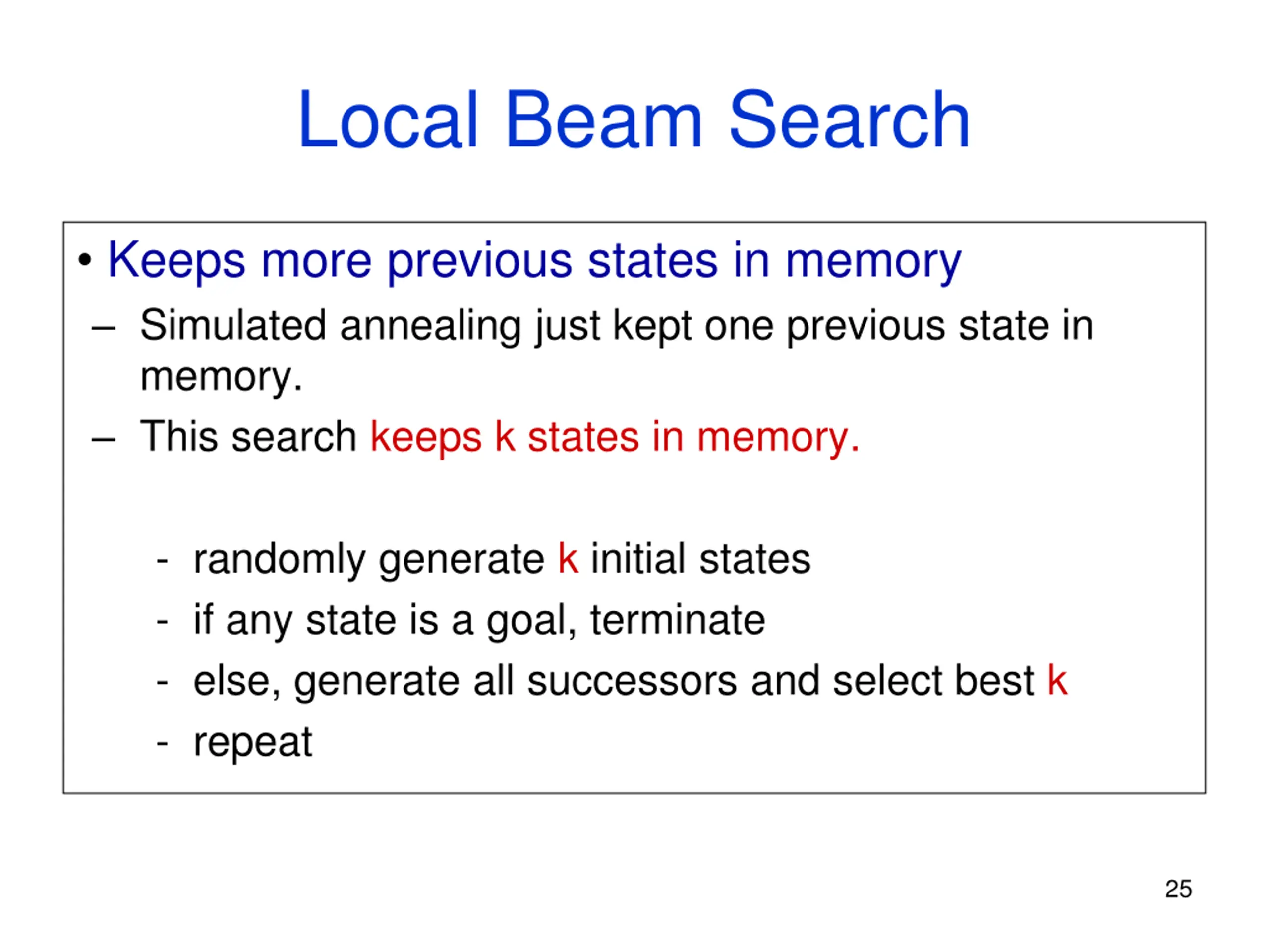 Local Beam Search Keeps more previous states in memory Simulated annealing just kept one previous state in memory. This search keeps k states in memory. - randomly generate k initial states - if any state is a goal, terminate - else, generate all successors and select best k - repeat 25