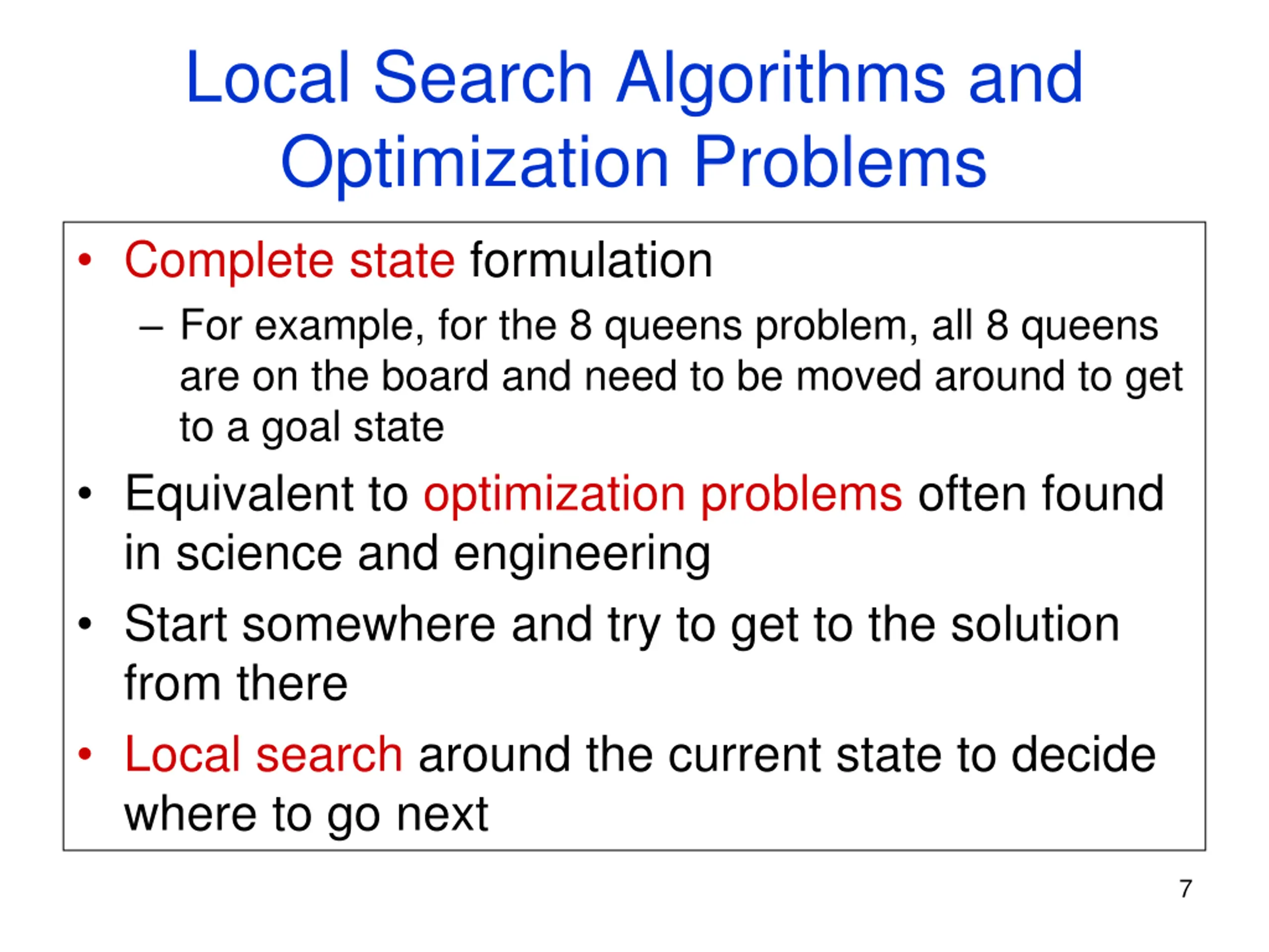 Local Search Algorithms and Optimization Problems Complete state formulation For example, for the 8 queens problem, all 8 queens are on the board and need to be moved around to get to a goal state Equivalent to optimization problems often found in science and engineering Start somewhere and try to get to the solution from there Local search around the current state to decide where to go next 7