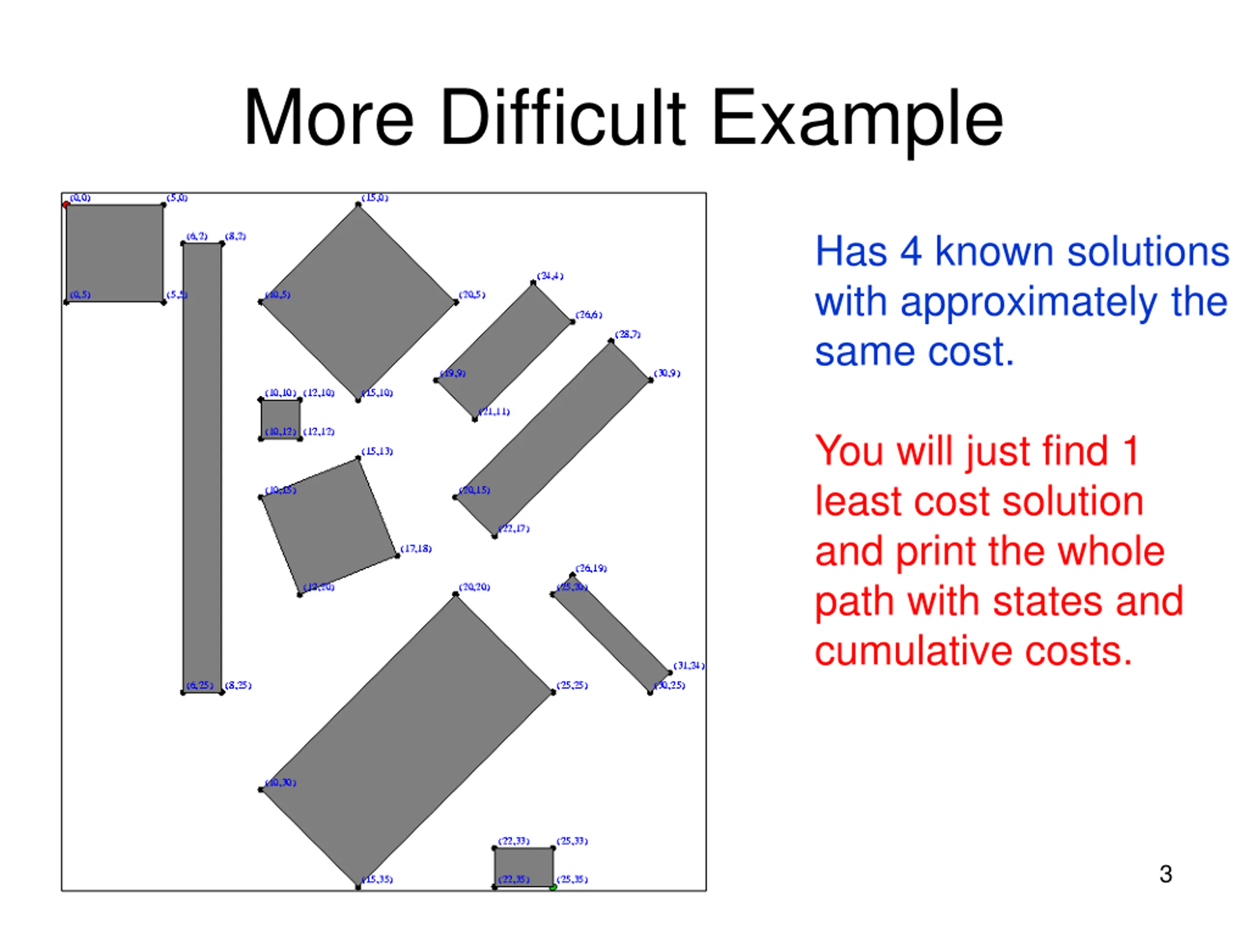More Difficult Example Has 4 known solutions with approximately the same cost. You will just find 1 least cost solution and print the whole path with states and cumulative costs. 3