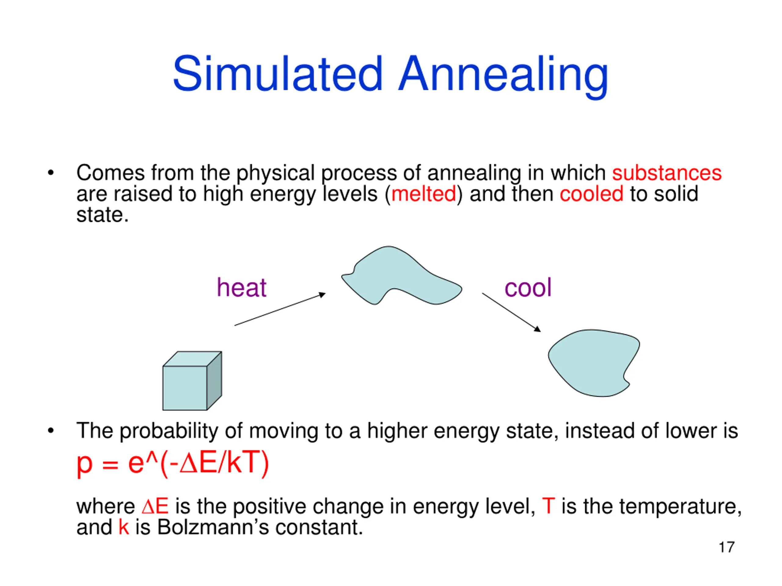 Simulated Annealing Comes from the physical process of annealing in which substances are raised to high energy levels (melted) and then cooled to solid state. heat cool The probability of moving to a higher energy state, instead of lower is p = e^(- E/kT) where E is the positive change in energy level, T is the temperature, and k is Bolzmann s constant. 17