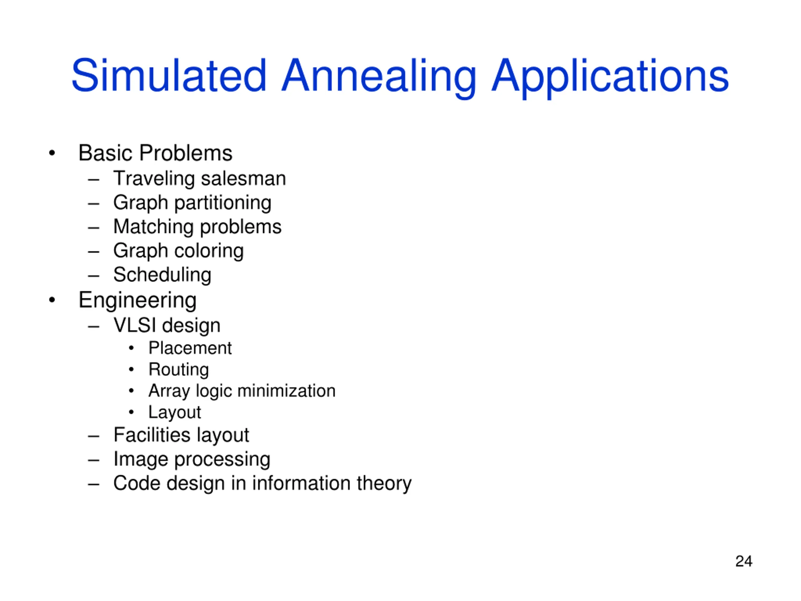 Simulated Annealing Applications Basic Problems Traveling salesman Graph partitioning Matching problems Graph coloring Scheduling Engineering VLSI design Placement Routing Array logic minimization Layout Facilities layout Image processing Code design in information theory 24