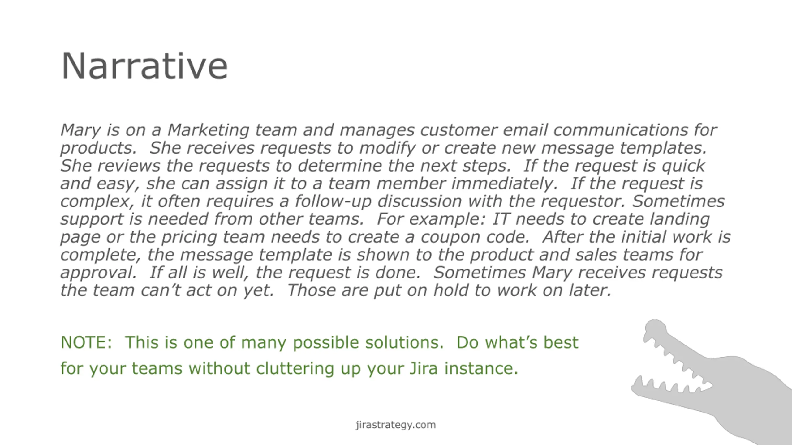Narrative Mary is on a Marketing team and manages customer email communications for products. She receives requests to modify or create new message templates. She reviews the requests to determine the next steps. If the request is quick and easy, she can assign it to a team member immediately. If the request is complex, it often requires a follow-up discussion with the requestor. Sometimes support is needed from other teams. For example: IT needs to create landing page or the pricing team needs to create a coupon code. After the initial work is complete, the message template is shown to the product and sales teams for approval. If all is well, the request is done. Sometimes Mary receives requests the team can t act on yet. Those are put on hold to work on later. NOTE: This is one of many possible solutions. Do what s best for your teams without cluttering up your Jira instance. jirastrategy.com