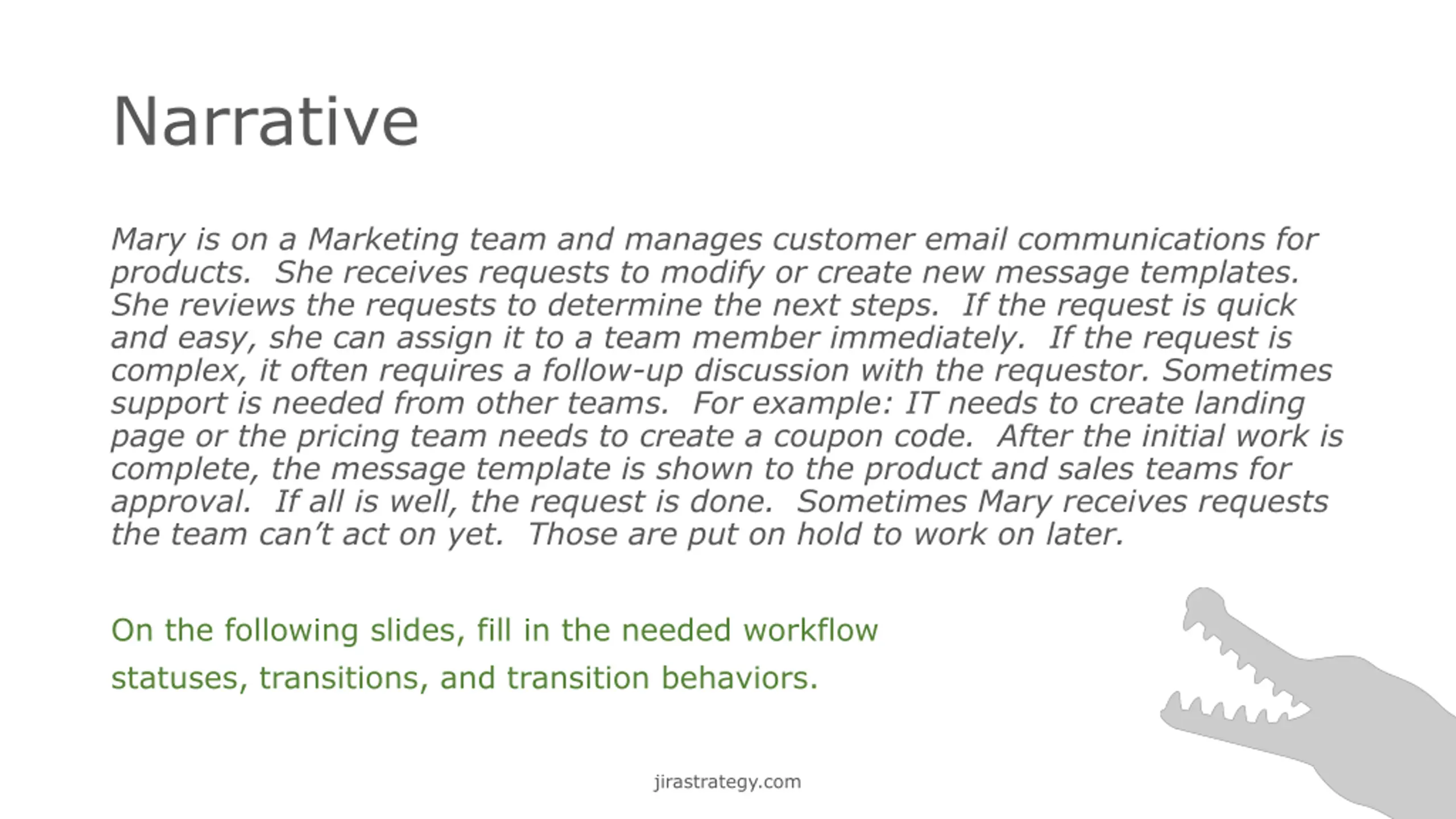 Narrative Mary is on a Marketing team and manages customer email communications for products. She receives requests to modify or create new message templates. She reviews the requests to determine the next steps. If the request is quick and easy, she can assign it to a team member immediately. If the request is complex, it often requires a follow-up discussion with the requestor. Sometimes support is needed from other teams. For example: IT needs to create landing page or the pricing team needs to create a coupon code. After the initial work is complete, the message template is shown to the product and sales teams for approval. If all is well, the request is done. Sometimes Mary receives requests the team can t act on yet. Those are put on hold to work on later. On the following slides, fill in the needed workflow statuses, transitions, and transition behaviors. jirastrategy.com