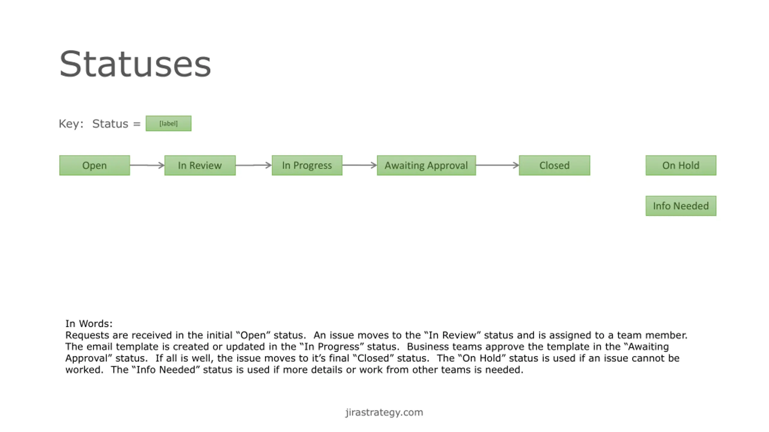 Statuses Key: Status = [label] In Progress Open Awaiting Approval Closed On Hold In Review Info Needed In Words: Requests are received in the initial Open status. An issue moves to the In Review status and is assigned to a team member. The email template is created or updated in the In Progress status. Business teams approve the template in the Awaiting Approval status. If all is well, the issue moves to it s final Closed status. The On Hold status is used if an issue cannot be worked. The Info Needed status is used if more details or work from other teams is needed. jirastrategy.com