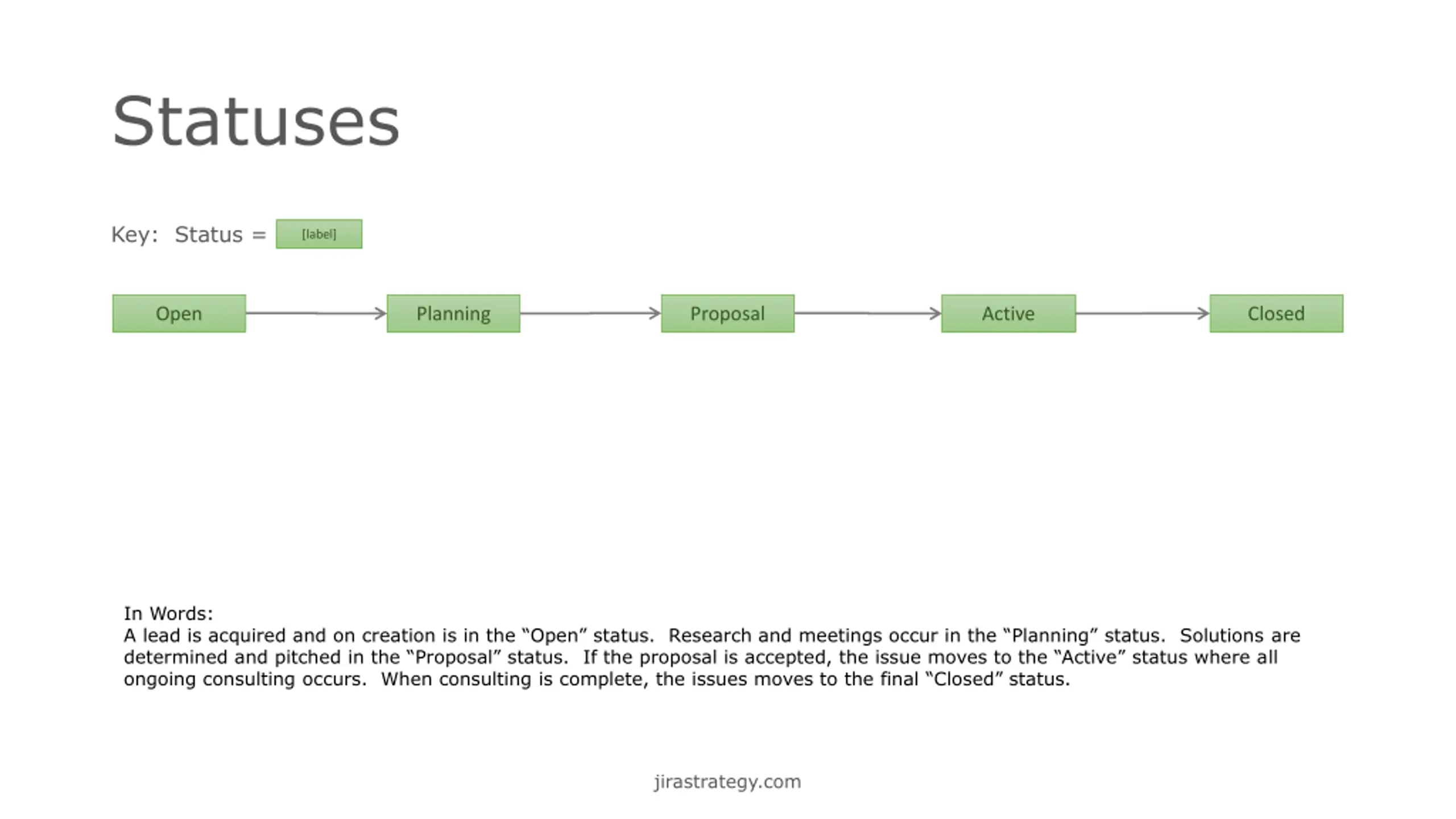 Statuses Key: Status = [label] Open Proposal Closed Planning Active In Words: A lead is acquired and on creation is in the Open status. Research and meetings occur in the Planning status. Solutions are determined and pitched in the Proposal status. If the proposal is accepted, the issue moves to the Active status where all ongoing consulting occurs. When consulting is complete, the issues moves to the final Closed status. jirastrategy.com