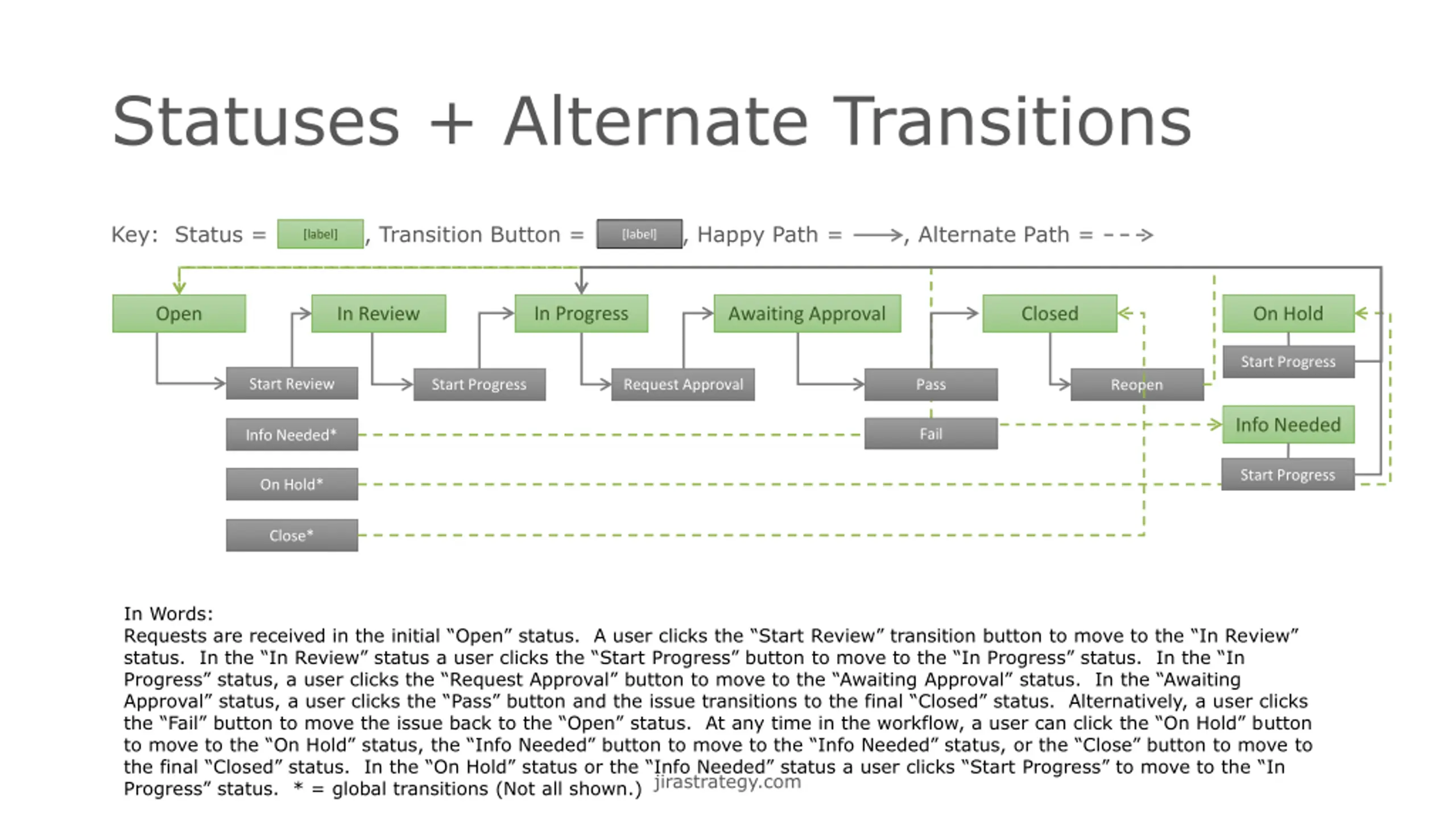 Statuses + Alternate Transitions Key: Status = , Transition Button = , Happy Path = , Alternate Path = [label] [label] In Progress Open Awaiting Approval Closed On Hold In Review Start Progress Start Review Start Progress Request Approval Pass Reopen Info Needed Fail Info Needed* Start Progress On Hold* Close* In Words: Requests are received in the initial Open status. A user clicks the Start Review transition button to move to the In Review status. In the In Review status a user clicks the Start Progress button to move to the In Progress status. In the In Progress status, a user clicks the Request Approval button to move to the Awaiting Approval status. In the Awaiting Approval status, a user clicks the Pass button and the issue transitions to the final Closed status. Alternatively, a user clicks the Fail button to move the issue back to the Open status. At any time in the workflow, a user can click the On Hold button to move to the On Hold status, the Info Needed button to move to the Info Needed status, or the Close button to move to the final Closed status. In the On Hold status or the Info Needed status a user clicks Start Progress to move to the In Progress status. * = global transitions (Not all shown.) jirastrategy.com