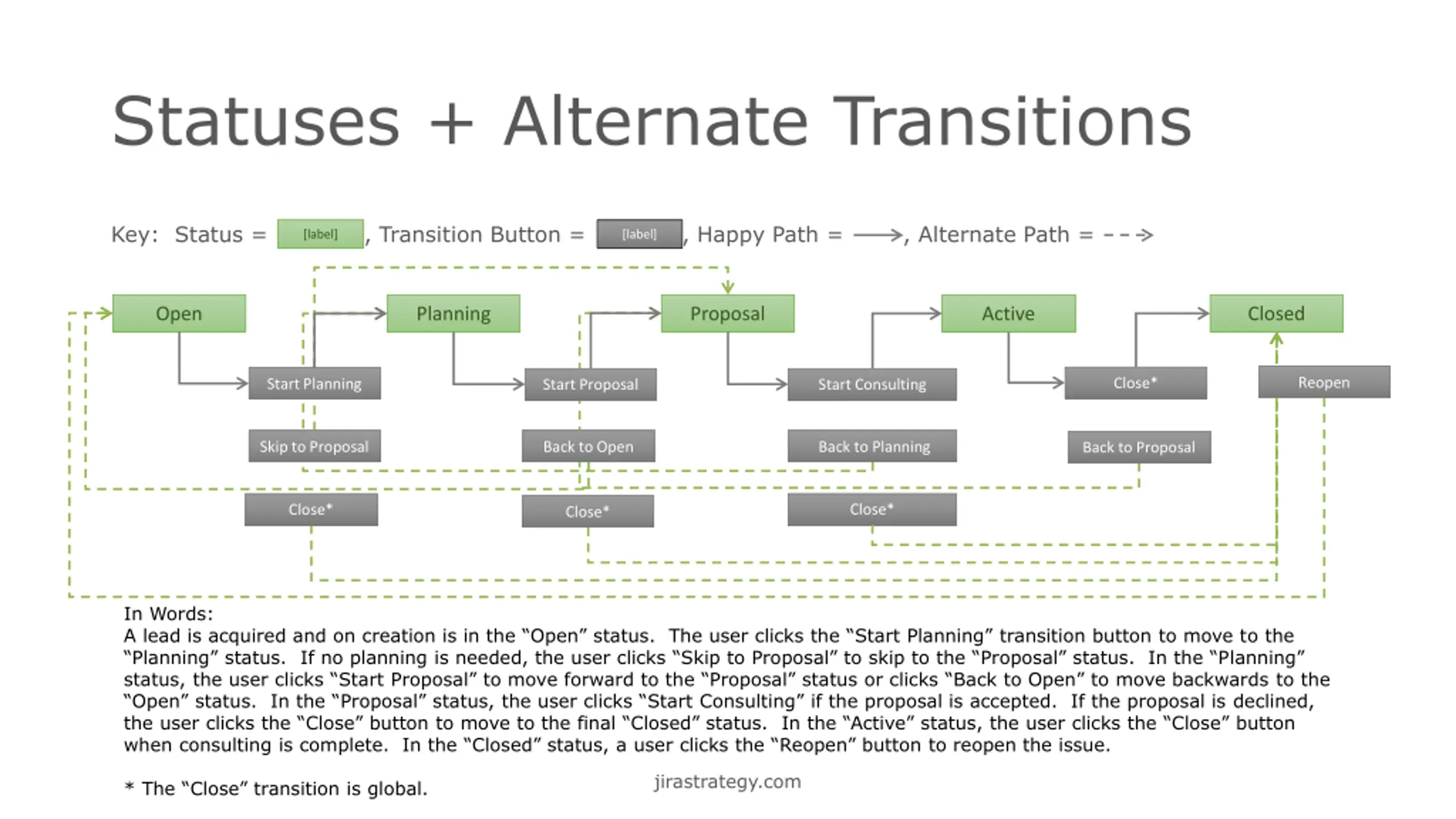 Statuses + Alternate Transitions Key: Status = , Transition Button = , Happy Path = , Alternate Path = [label] [label] Open Proposal Closed Planning Active Reopen Close* Start Planning Start Proposal Start Consulting Skip to Proposal Back to Open Back to Planning Back to Proposal Close* Close* Close* In Words: A lead is acquired and on creation is in the Open status. The user clicks the Start Planning transition button to move to the Planning status. If no planning is needed, the user clicks Skip to Proposal to skip to the Proposal status. In the Planning status, the user clicks Start Proposal to move forward to the Proposal status or clicks Back to Open to move backwards to the Open status. In the Proposal status, the user clicks Start Consulting if the proposal is accepted. If the proposal is declined, the user clicks the Close button to move to the final Closed status. In the Active status, the user clicks the Close button when consulting is complete. In the Closed status, a user clicks the Reopen button to reopen the issue. jirastrategy.com * The Close transition is global.