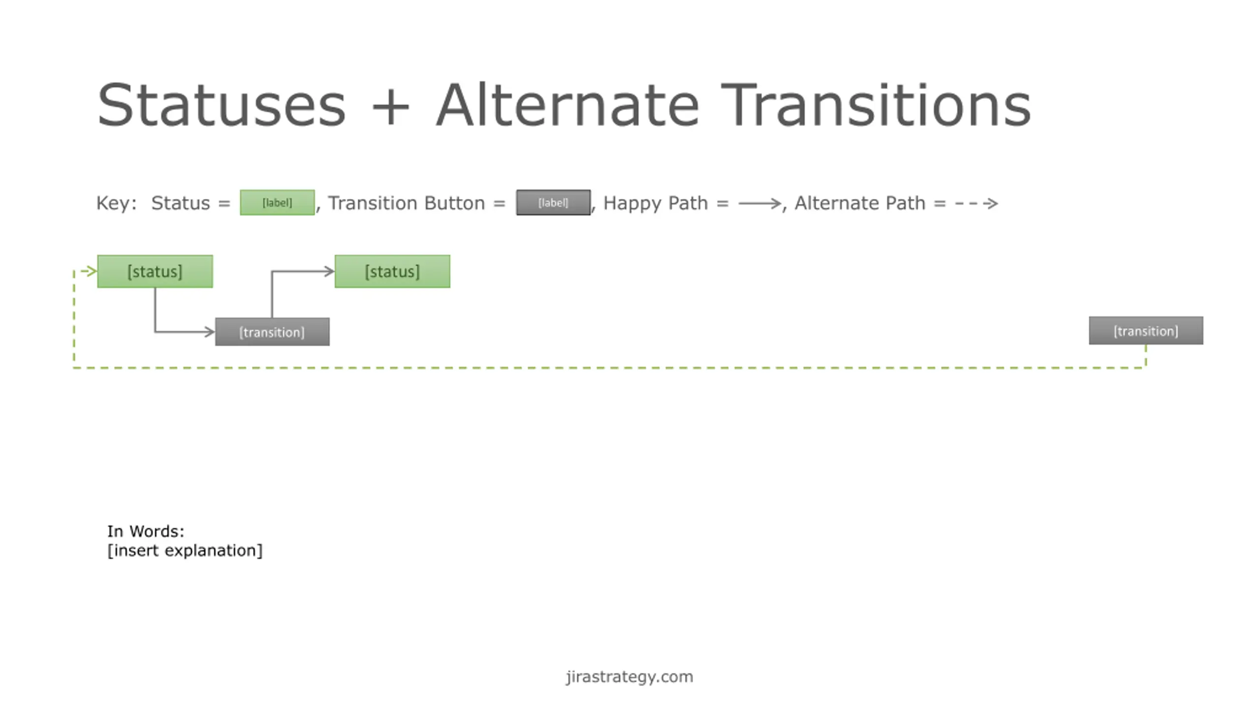 Statuses + Alternate Transitions Key: Status = , Transition Button = , Happy Path = , Alternate Path = [label] [label] [status] [status] [transition] [transition] In Words: [insert explanation] jirastrategy.com
