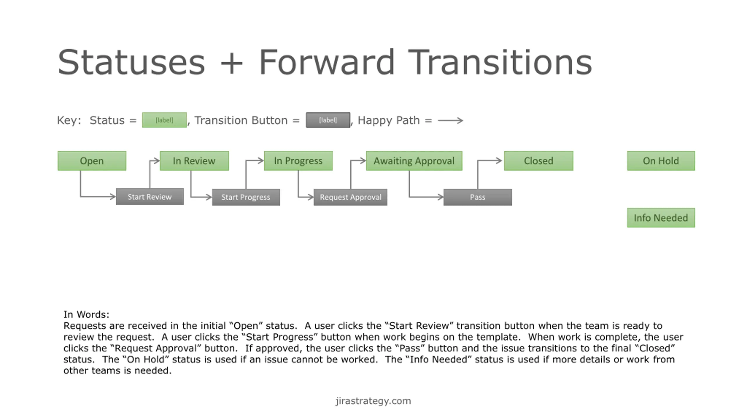 Statuses + Forward Transitions Key: Status = , Transition Button = , Happy Path = [label] [label] In Progress Open Awaiting Approval Closed On Hold In Review Start Review Start Progress Request Approval Pass Info Needed In Words: Requests are received in the initial Open status. A user clicks the Start Review transition button when the team is ready to review the request. A user clicks the Start Progress button when work begins on the template. When work is complete, the user clicks the Request Approval button. If approved, the user clicks the Pass button and the issue transitions to the final Closed status. The On Hold status is used if an issue cannot be worked. The Info Needed status is used if more details or work from other teams is needed. jirastrategy.com
