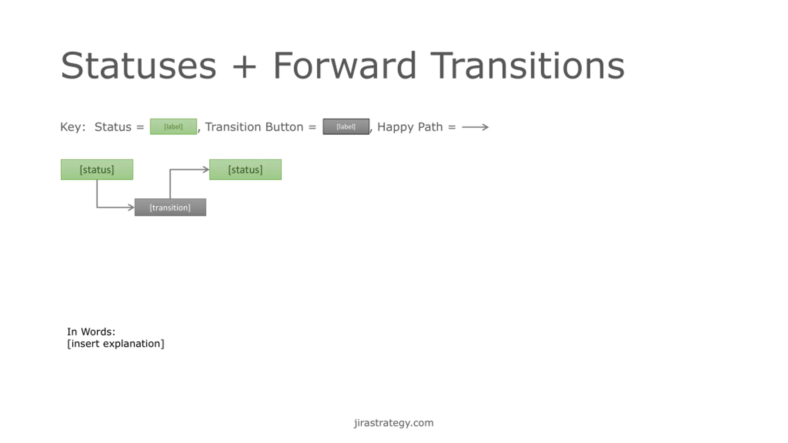 Statuses + Forward Transitions Key: Status = , Transition Button = , Happy Path = [label] [label] [status] [status] [transition] In Words: [insert explanation] jirastrategy.com