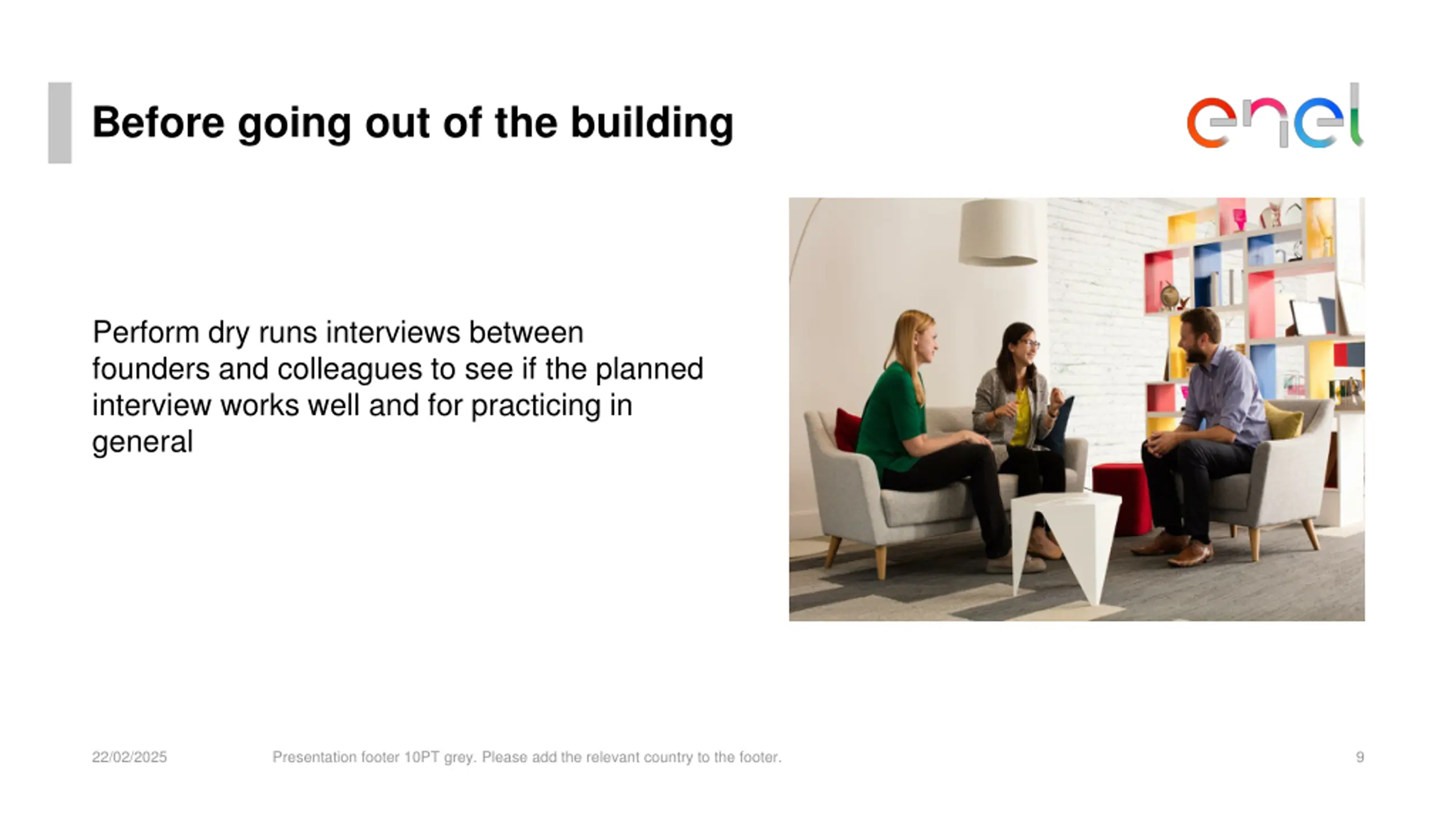 Before going out of the building Perform dry runs interviews between founders and colleagues to see if the planned interview works well and for practicing in general 22/02/2025 Presentation footer 10PT grey. Please add the relevant country to the footer. 9