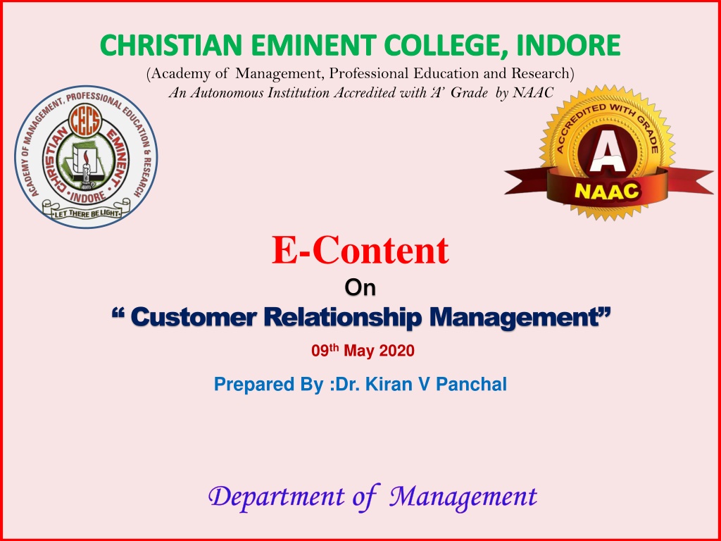 CHRISTIAN EMINENT COLLEGE, INDORE (Academy of Management, Professional Education and Research) An Autonomous Institution Accredited with A Grade by NAAC E-Content On Customer Relationship Management 09th May 2020 Prepared By :Dr. Kiran V Panchal Department of Management