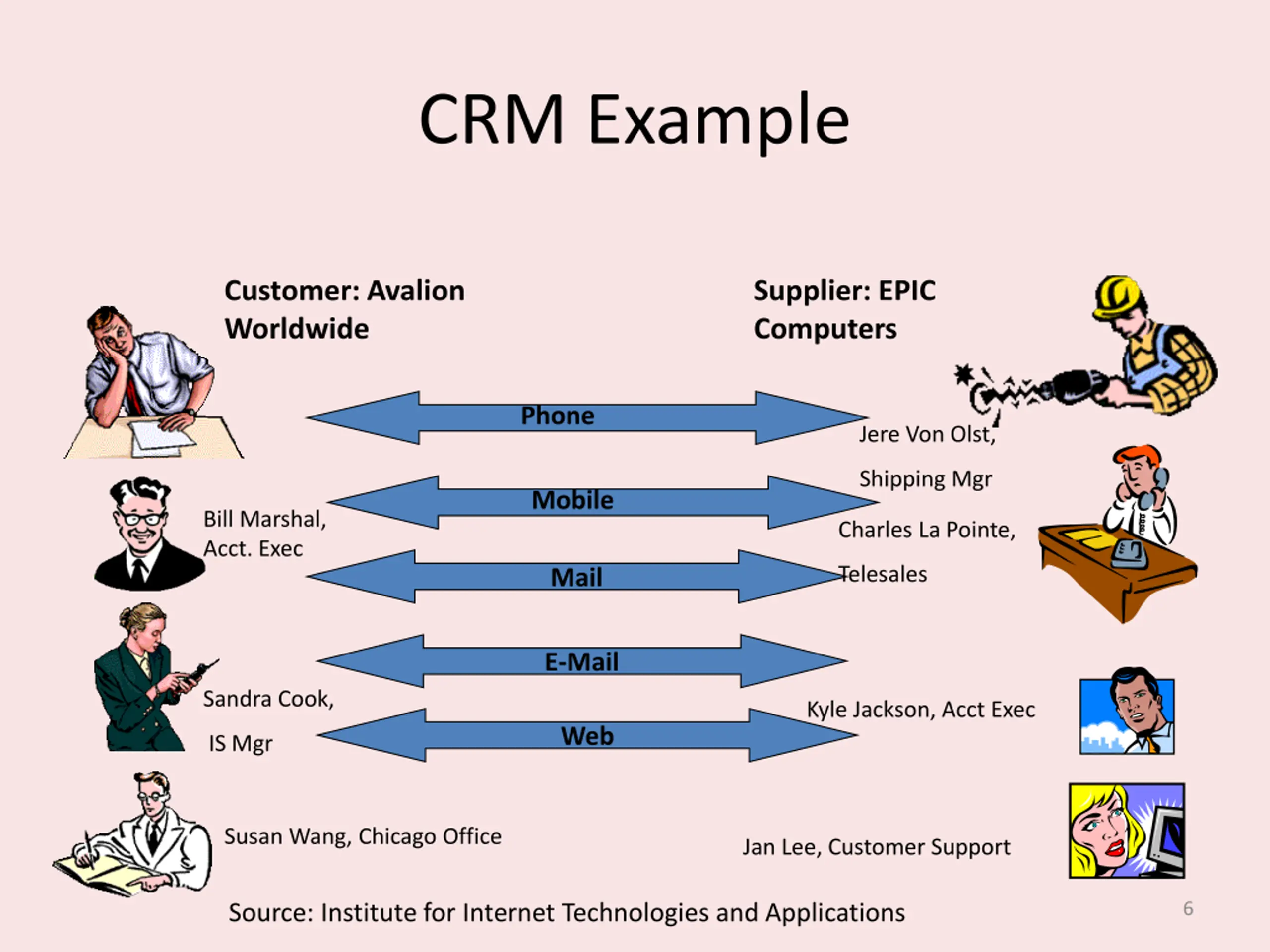 CRM Example Customer: Avalion Worldwide Supplier: EPIC Computers Phone Jere Von Olst, Shipping Mgr Mobile Bill Marshal, Acct. Exec Charles La Pointe, Telesales Mail E-Mail Sandra Cook, Kyle Jackson, Acct Exec Web IS Mgr Susan Wang, Chicago Office Jan Lee, Customer Support 6 Source: Institute for Internet Technologies and Applications