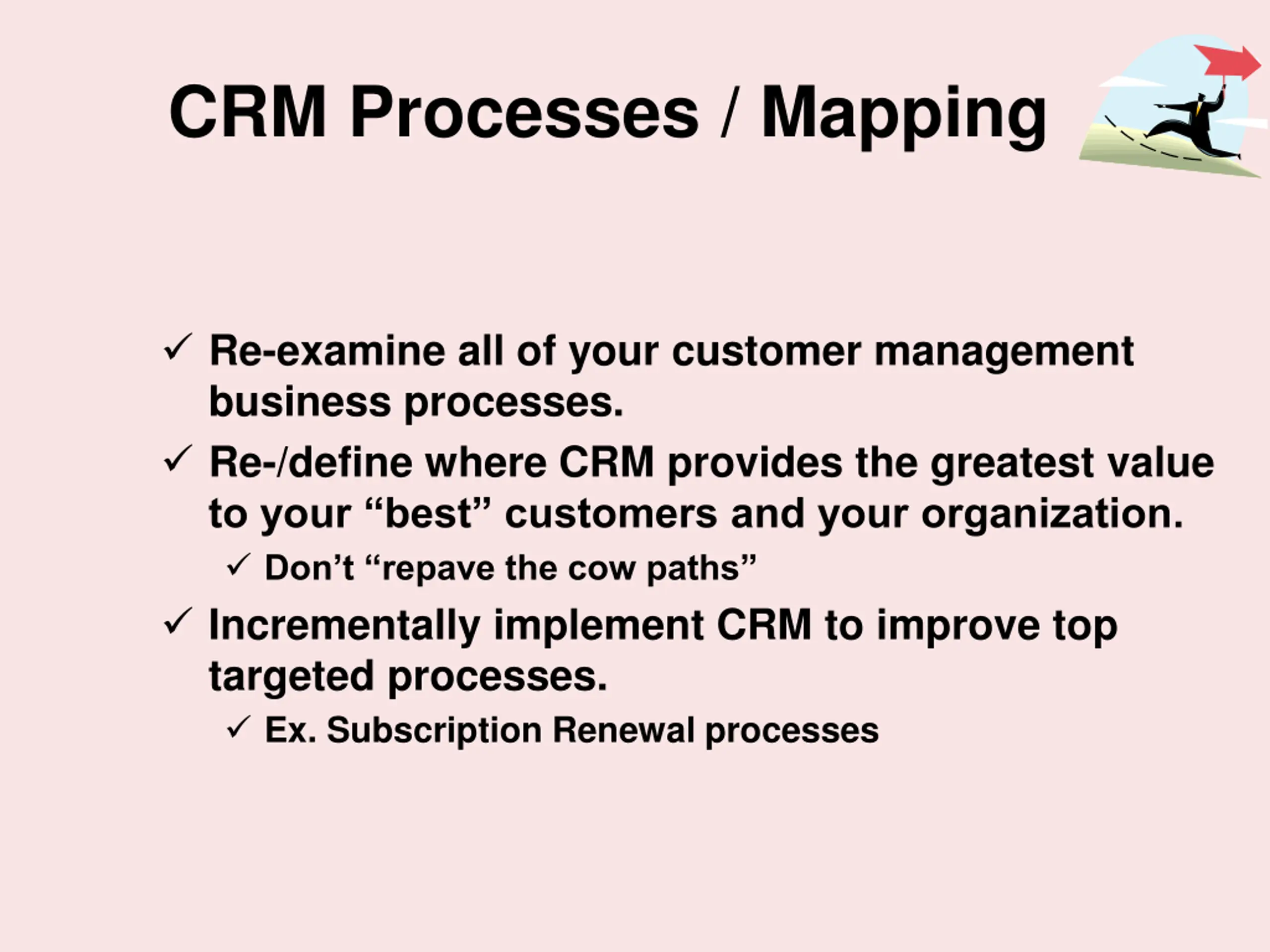 CRM Processes / Mapping Re-examine all of your customer management business processes. Re-/define where CRM provides the greatest value to your best customers and your organization. Don t repave the cow paths Incrementally implement CRM to improve top targeted processes. Ex. Subscription Renewal processes