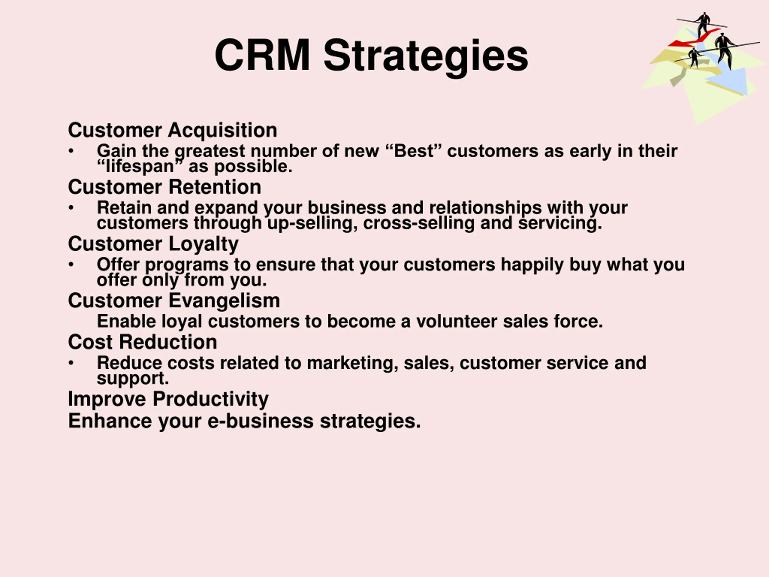 CRM Strategies Customer Acquisition Gain the greatest number of new Best customers as early in their lifespan as possible. Customer Retention Retain and expand your business and relationships with your customers through up-selling, cross-selling and servicing. Customer Loyalty Offer programs to ensure that your customers happily buy what you offer only from you. Customer Evangelism Enable loyal customers to become a volunteer sales force. Cost Reduction Reduce costs related to marketing, sales, customer service and support. Improve Productivity Enhance your e-business strategies.