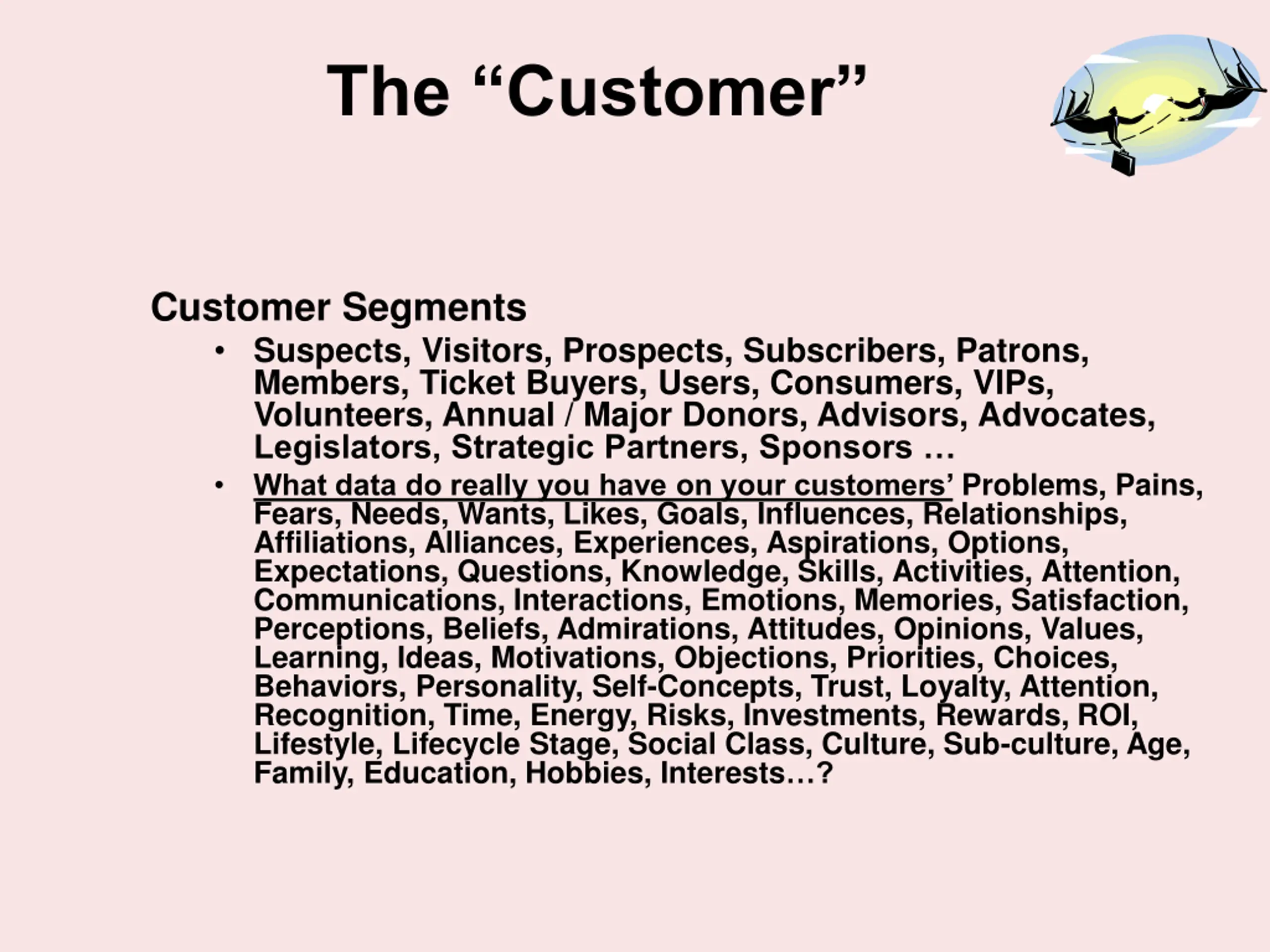 The Customer Customer Segments Suspects, Visitors, Prospects, Subscribers, Patrons, Members, Ticket Buyers, Users, Consumers, VIPs, Volunteers, Annual / Major Donors, Advisors, Advocates, Legislators, Strategic Partners, Sponsors What data do really you have on your customers Problems, Pains, Fears, Needs, Wants, Likes, Goals, Influences, Relationships, Affiliations, Alliances, Experiences, Aspirations, Options, Expectations, Questions, Knowledge, Skills, Activities, Attention, Communications, Interactions, Emotions, Memories, Satisfaction, Perceptions, Beliefs, Admirations, Attitudes, Opinions, Values, Learning, Ideas, Motivations, Objections, Priorities, Choices, Behaviors, Personality, Self-Concepts, Trust, Loyalty, Attention, Recognition, Time, Energy, Risks, Investments, Rewards, ROI, Lifestyle, Lifecycle Stage, Social Class, Culture, Sub-culture, Age, Family, Education, Hobbies, Interests ?