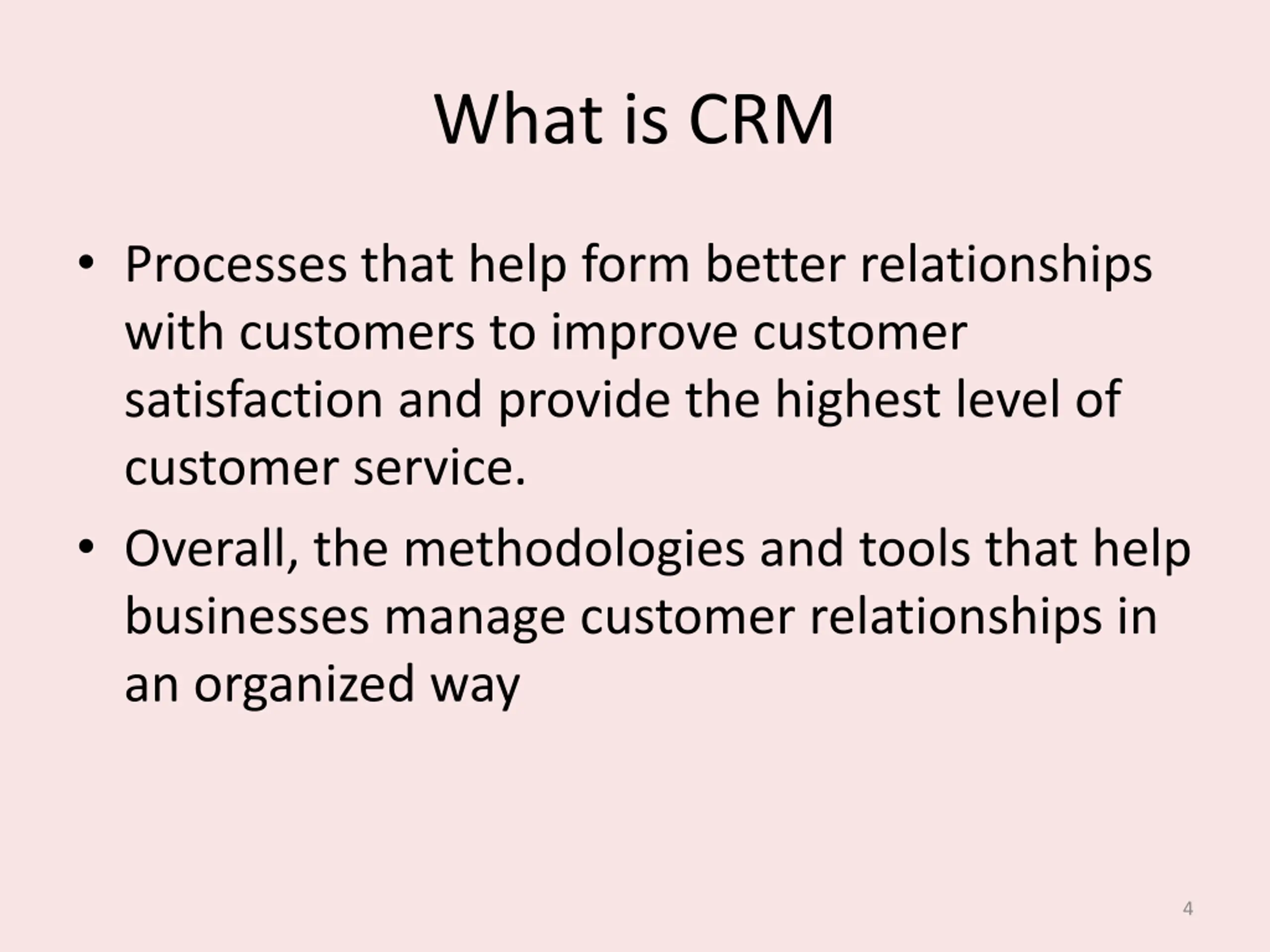 What is CRM Processes that help form better relationships with customers to improve customer satisfaction and provide the highest level of customer service. Overall, the methodologies and tools that help businesses manage customer relationships in an organized way 4
