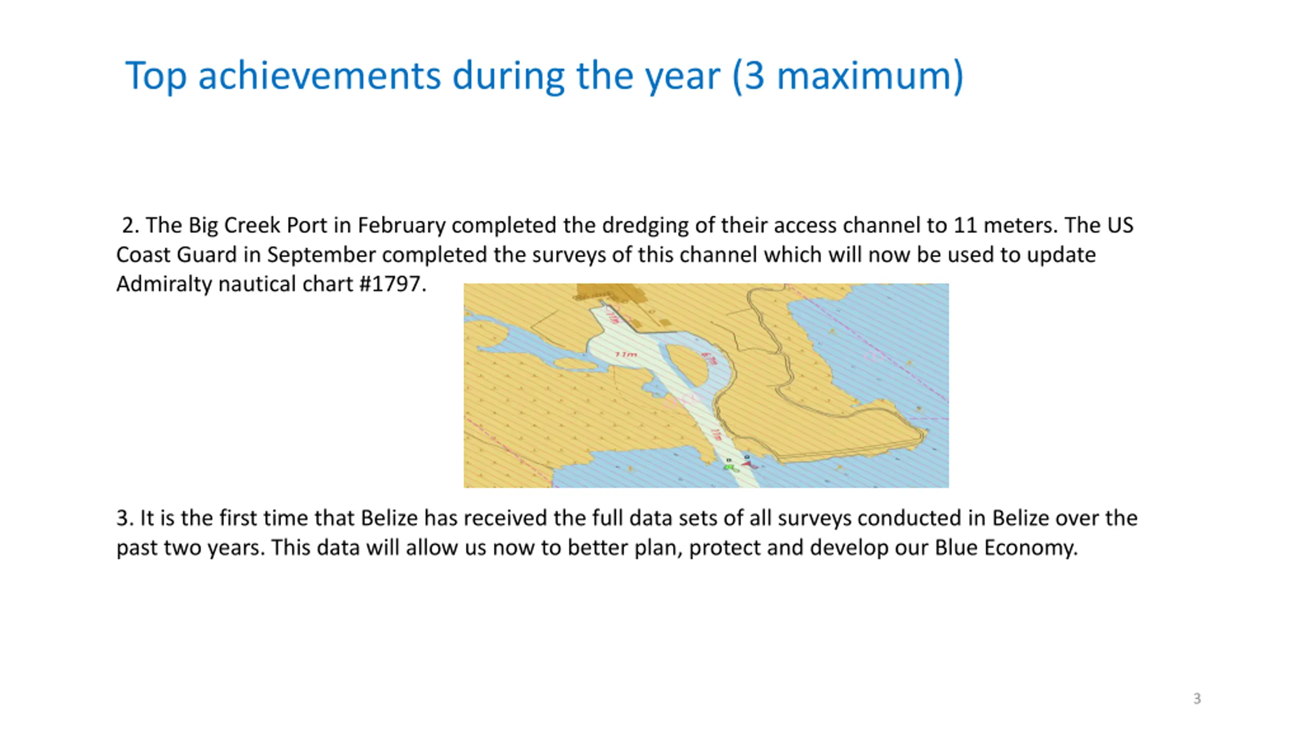 Top achievements during the year (3 maximum) 2. The Big Creek Port in February completed the dredging of their access channel to 11 meters. The US Coast Guard in September completed the surveys of this channel which will now be used to update Admiralty nautical chart #1797. 3. It is the first time that Belize has received the full data sets of all surveys conducted in Belize over the past two years. This data will allow us now to better plan, protect and develop our Blue Economy. 3