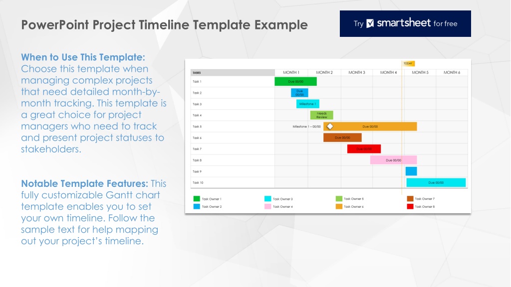 A blue and white sign Description automatically generated PowerPoint Project Timeline Template Example When to Use This Template: Choose this template when managing complex projects that need detailed month-by- month tracking. This template is a great choice for project managers who need to track and present project statuses to stakeholders. Notable Template Features: This fully customizable Gantt chart template enables you to set your own timeline. Follow the sample text for help mapping out your project s timeline.