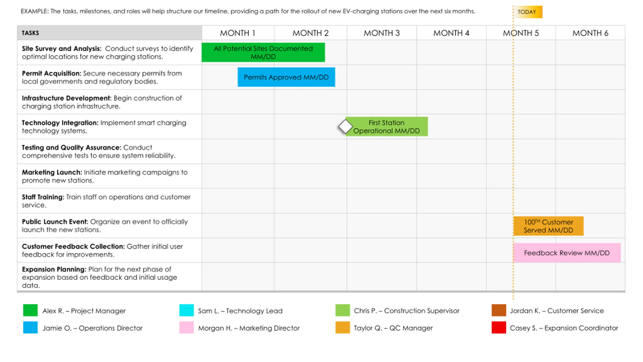 EXAMPLE: The tasks, milestones, and roles will help structure our timeline, providing a path for the rollout of new EV-charging stations over the next six months. TODAY MONTH 1 MONTH 2 MONTH 3 MONTH 4 MONTH 5 MONTH 6 TASKS All Potential Sites Documented MM/DD Site Survey and Analysis: Conduct surveys to identify optimal locations for new charging stations. Permit Acquisition: Secure necessary permits from local governments and regulatory bodies. Permits Approved MM/DD Infrastructure Development: Begin construction of charging station infrastructure. First Station Operational MM/DD Technology Integration: Implement smart charging technology systems. Testing and Quality Assurance: Conduct comprehensive tests to ensure system reliability. Marketing Launch: Initiate marketing campaigns to promote new stations. Staff Training: Train staff on operations and customer service. Public Launch Event: Organize an event to officially launch the new stations. 100TH Customer Served MM/DD Customer Feedback Collection: Gather initial user feedback for improvements. Feedback Review MM/DD Expansion Planning: Plan for the next phase of expansion based on feedback and initial usage data. Jordan K. Customer Service Chris P. Construction Supervisor Sam L. Technology Lead Alex R. Project Manager Casey S. Expansion Coordinator Taylor Q. QC Manager Morgan H. Marketing Director Jamie O. Operations Director