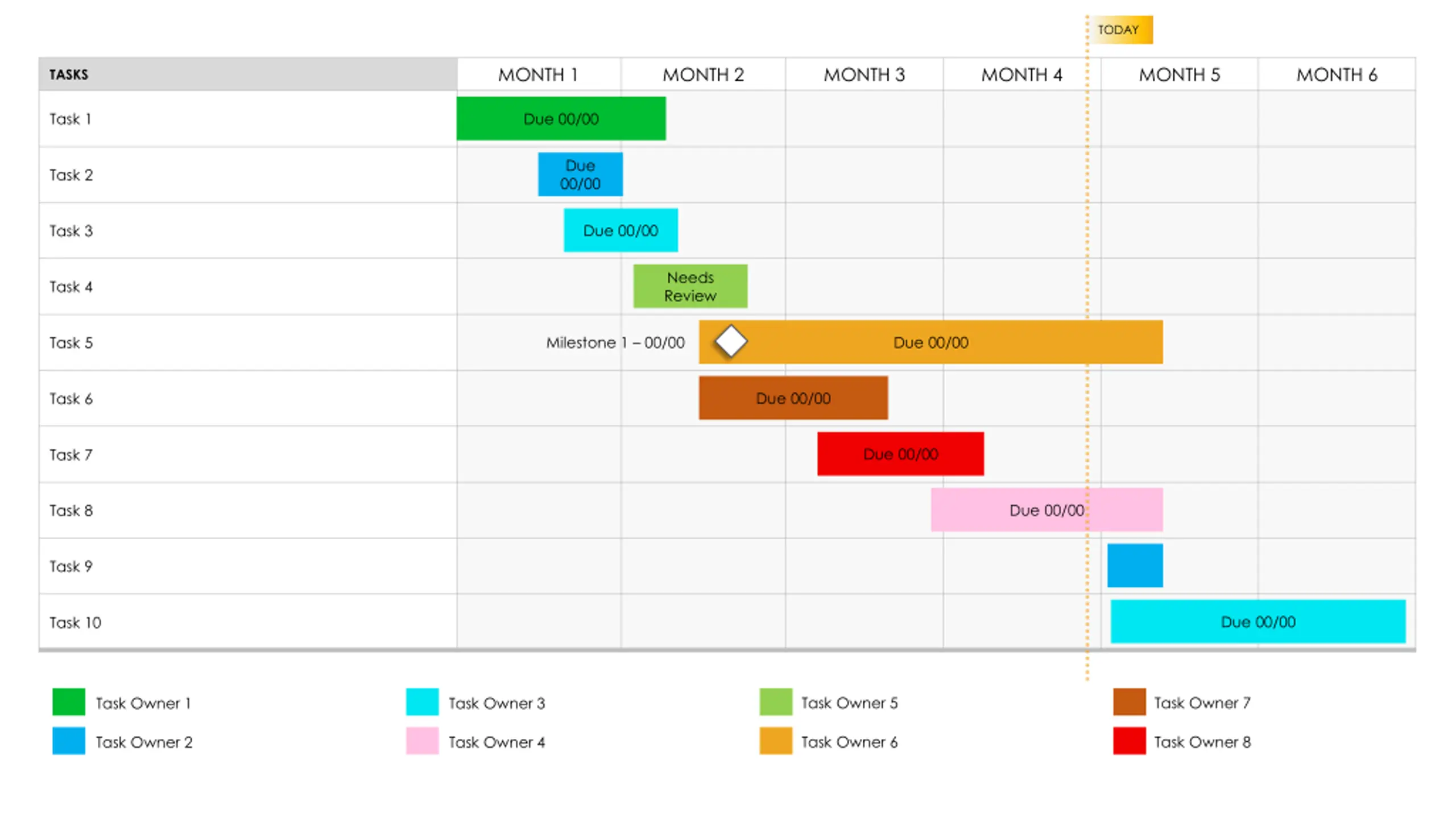 TODAY MONTH 1 MONTH 2 MONTH 3 MONTH 4 MONTH 5 MONTH 6 TASKS Due 00/00 Task 1 Due 00/00 Task 2 Due 00/00 Task 3 Needs Review Task 4 Milestone 1 00/00 Due 00/00 Task 5 Due 00/00 Task 6 Due 00/00 Task 7 Due 00/00 Task 8 Task 9 Due 00/00 Task 10 Task Owner 7 Task Owner 5 Task Owner 3 Task Owner 1 Task Owner 8 Task Owner 6 Task Owner 4 Task Owner 2
