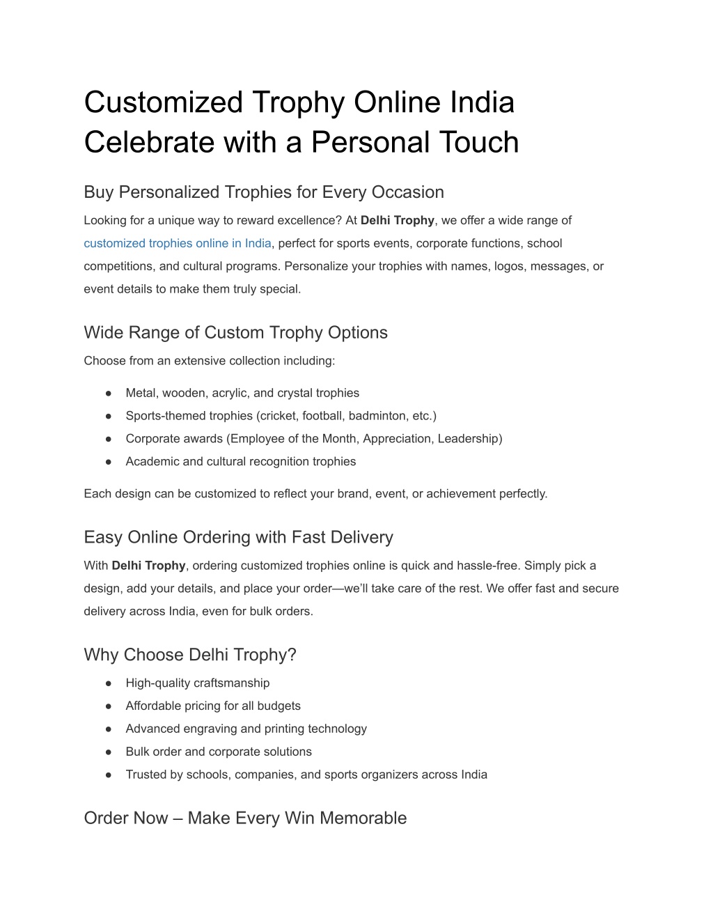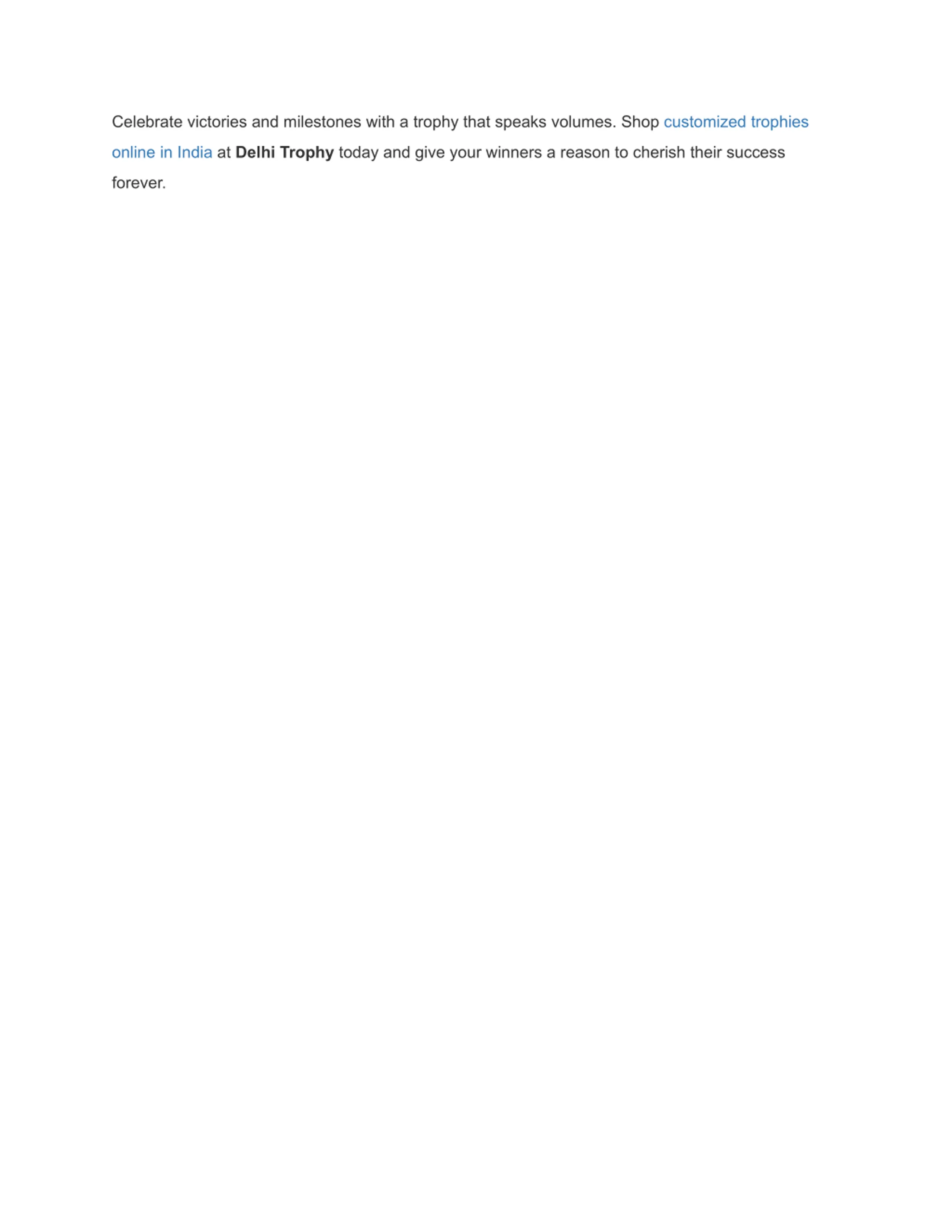 Customized Trophy Online India Celebrate with a Personal Touch Buy Personalized Trophies for Every Occasion Looking for a unique way to reward excellence? At Delhi Trophy, we offer a wide range of customized trophies online in India, perfect for sports events, corporate functions, school competitions, and cultural programs. Personalize your trophies with names, logos, messages, or event details to make them truly special. Wide Range of Custom Trophy Options Choose from an extensive collection including: Metal, wooden, acrylic, and crystal trophies Sports-themed trophies (cricket, football, badminton, etc.) Corporate awards (Employee of the Month, Appreciation, Leadership) Academic and cultural recognition trophies Each design can be customized to reflect your brand, event, or achievement perfectly. Easy Online Ordering with Fast Delivery With Delhi Trophy, ordering customized trophies online is quick and hassle-free. Simply pick a design, add your details, and place your order we ll take care of the rest. We offer fast and secure delivery across India, even for bulk orders. Why Choose Delhi Trophy? High-quality craftsmanship Affordable pricing for all budgets Advanced engraving and printing technology Bulk order and corporate solutions Trusted by schools, companies, and sports organizers across India Order Now Make Every Win Memorable